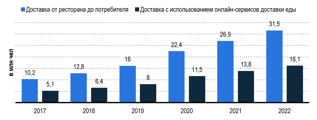 В 2021 году совокупное число пользователей сервисов и услуг доставки еды в России превысило 40 млн человек. Ожидается, что по итогам 2022 показатель увеличится до 47,6 млн человек. В 2021 году около 26,9 млн человек воспользовались онлайн-доставкой еды из ресторанов и сетей быстрого питания, что больше, чем численность пользователей онлайн-сервисов доставки еды почти в два раза. В тоже время, средний чек на одного пользователя сервисов доставки еды в среднем больше на 1,2 тыс. руб.