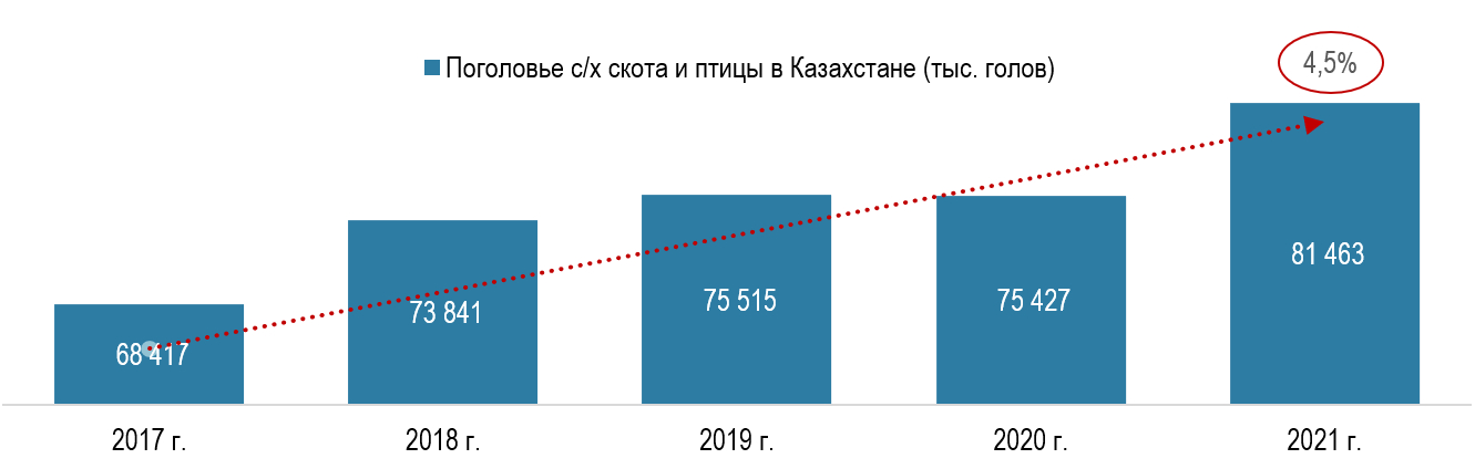 Государственная поддержка отрасли животноводства и благоприятная конъюнктура способствовали значительному увеличению численности поголовья сельскохозяйственного скота и птицы, находящихся во владении казахских животноводов. По данным Национального бюро статистики Казахстана с 2017 года поголовье сельскохозяйственного скота и птицы в стране увеличилось на 19,1%: с 68,4 млн голов в 2017 году до 81,5 млн голов в 2021 году. За последний год поголовье сельхозживотных увеличилось на 8%. Среднегодовая динамика прироста голов продуктивных животных за весь период наблюдения (CAGR 2017-2021) составила +4,5%.