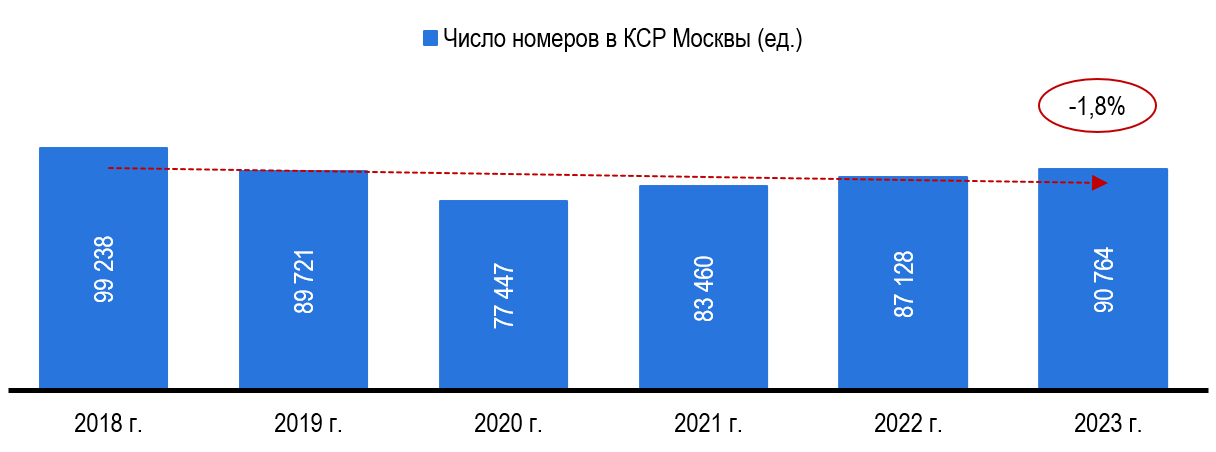 По данным Росстат (ЕМИСС) и Росаккредитации общий номерной фонд всех коллективных средств размещения Москвы сокращается со среднегодовыми темпами (CAGR 2018-2023) -1,8% в год и достигло на момент проведения исследования 90,8 тыс. номеров. Всего за последние шесть лет номерной фонд столицы сократился на 8,5%, при этом в 2023 году мы наблюдаем незначительный прирост количества номеров в столичных объектов.