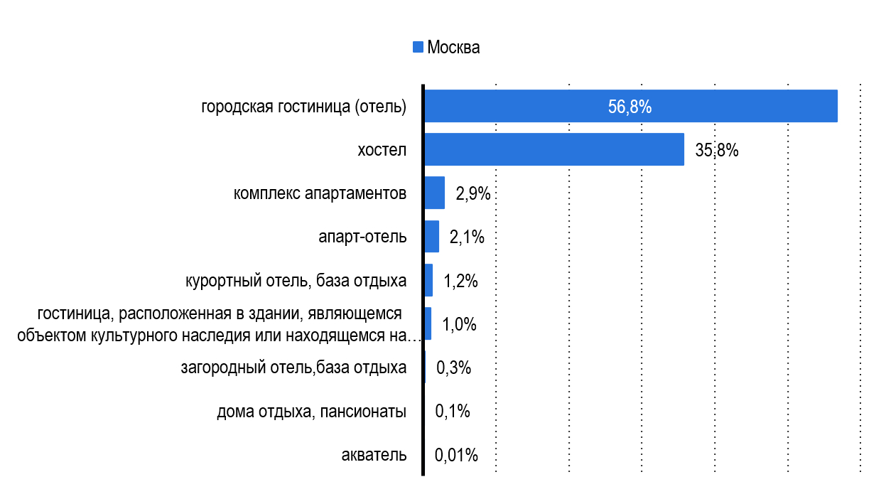 Исходя из данных Росаккредитации, наибольшее количество койко-мест в Москве представлено в хостелах (65,9% от общего количества койко-мест столицы), что свидетельствует о высоком спросе на размещение со стороны трудовых мигрантов.