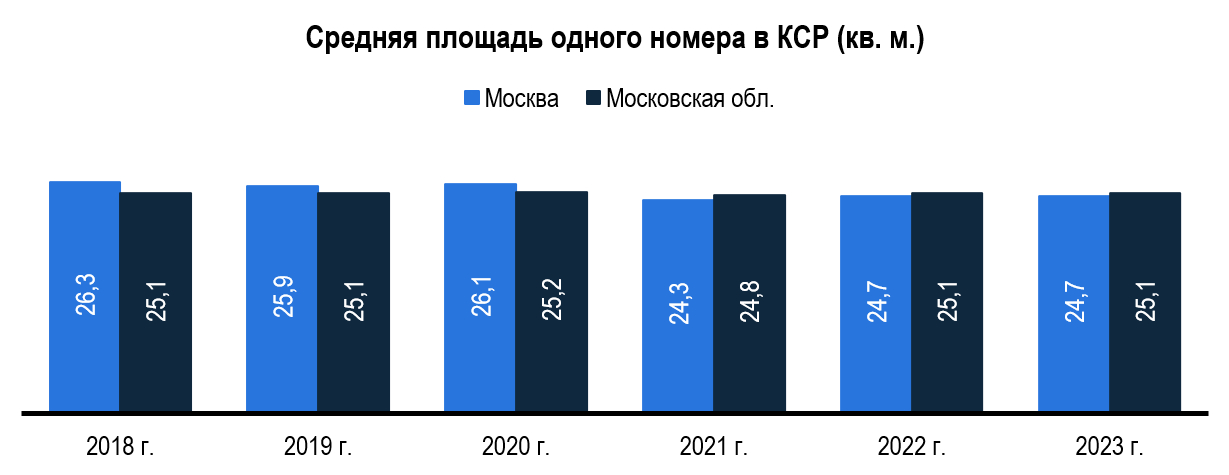 Средний размер одного номера в Москве ниже, чем в Подмосковье, примерно на полметра и составил в 2023 году 24.7 кв. метра против 25,1 кв. метров в Московской области. В Москве наблюдается явная тенденция к сокращению среднего размера номера. Тогда как в подмосковных гостиницах и других средствах размещения туристов средняя площадь номеров практически не менялась на протяжении последних двух лет.