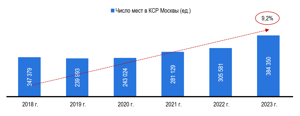 Общее число койко-мест, предназначенных для размещения туристов Москвы, на момент проведения исследования составило 384,4 тыс. мест. Динамика числа мест в коллективных средствах размещения столице выше, чем прирост номерного фонда: в среднем +9,2%, что свидетельствует о росте предложения в объектах с большей вместимостью номеров (например, хостелы для трудовых мигрантов).