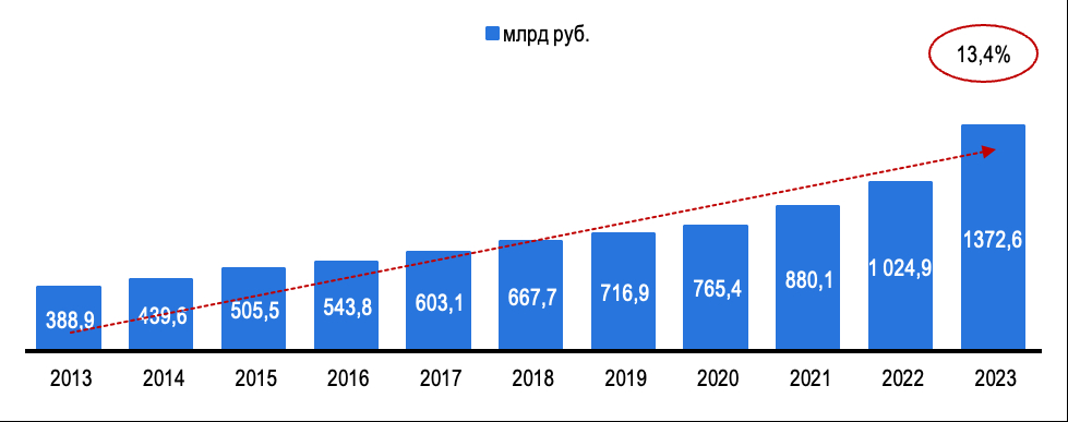 Косметический рынок России растет, по данным Росстат, в 2022 году выручка от розничных продаж косметики и парфюмерии в специализированных магазинах России превысила 1 024,9 млрд рублей. С 2013 года рынок вырос в 2,6 раз. По оценкам Statista, в 2023 году выручка от розничных продаж косметики и парфюмерии вырастет до 1 372,6 млрд рублей, при этом ежегодный прирост рынка (CAGR 2013-2023) в стоимостном выражении составит 13,4%.