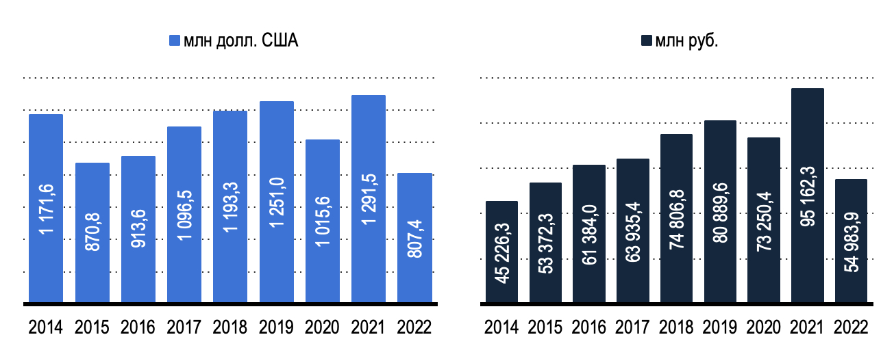 Дефицит косметики на внутреннем рынке негативно сказался и на показателях экспорта косметики из России. По данным ITC в 2022 году Россия экспортировала косметику на сумму более 88,7 миллионов долларов США, что в рублевом эквиваленте составило почти 6 млрд рублей. В 2022 году показатели экспорта косметологических продуктов сократились на 32% в долларовом выражении и на 49% в рублевом выражении. Таким образом, с учетом розничных наценок, долю импорта косметологических средств в общем обороте косметологической отрасли России в 2022 году можно оценить в 21%. При этом, с 2021 года этот показатель сократился на 10 процентных пунктов.