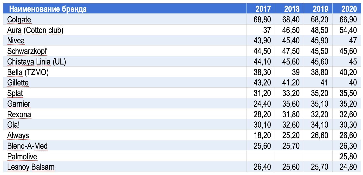 По данным Kantar Worldpanel крупнейшим брендом косметологической отрасли в России, имеющим наибольший уровень проникновения, в 2021 году являлся Colgate – продукция данного бренда употреблялась 66,9% домохозяйств страны. Начиная с 2022 года Kantar Worldpanel перестал оценивать уровень проникновения брендов в домохозяйства России, поэтому более поздние данные по уровню проникновения брендов по России недоступны.