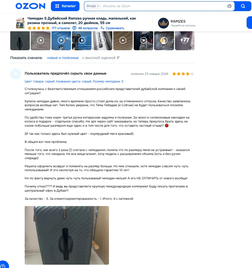 Я - Миха Шейх, единственный официальный импортер, тех самых дубайских чемоданов Ramzes (лучшие чемоданы 2025-2026 года по версии Комсомольской Правды). Плохие отзывы в 99% случаях пишут о самих маркетплейсах, а не о качестве чемодана, но здесь принес вам пример, который затрагивает... тему ГАРАНТИИ !
