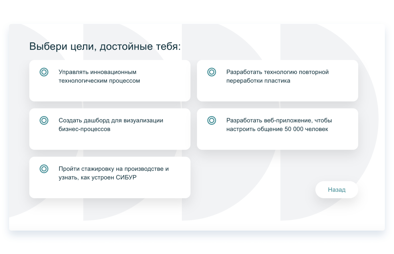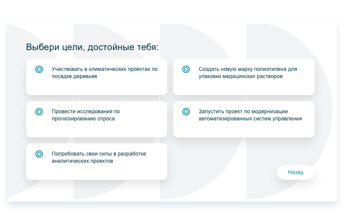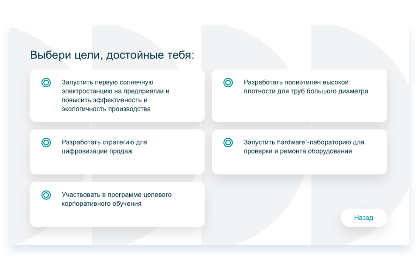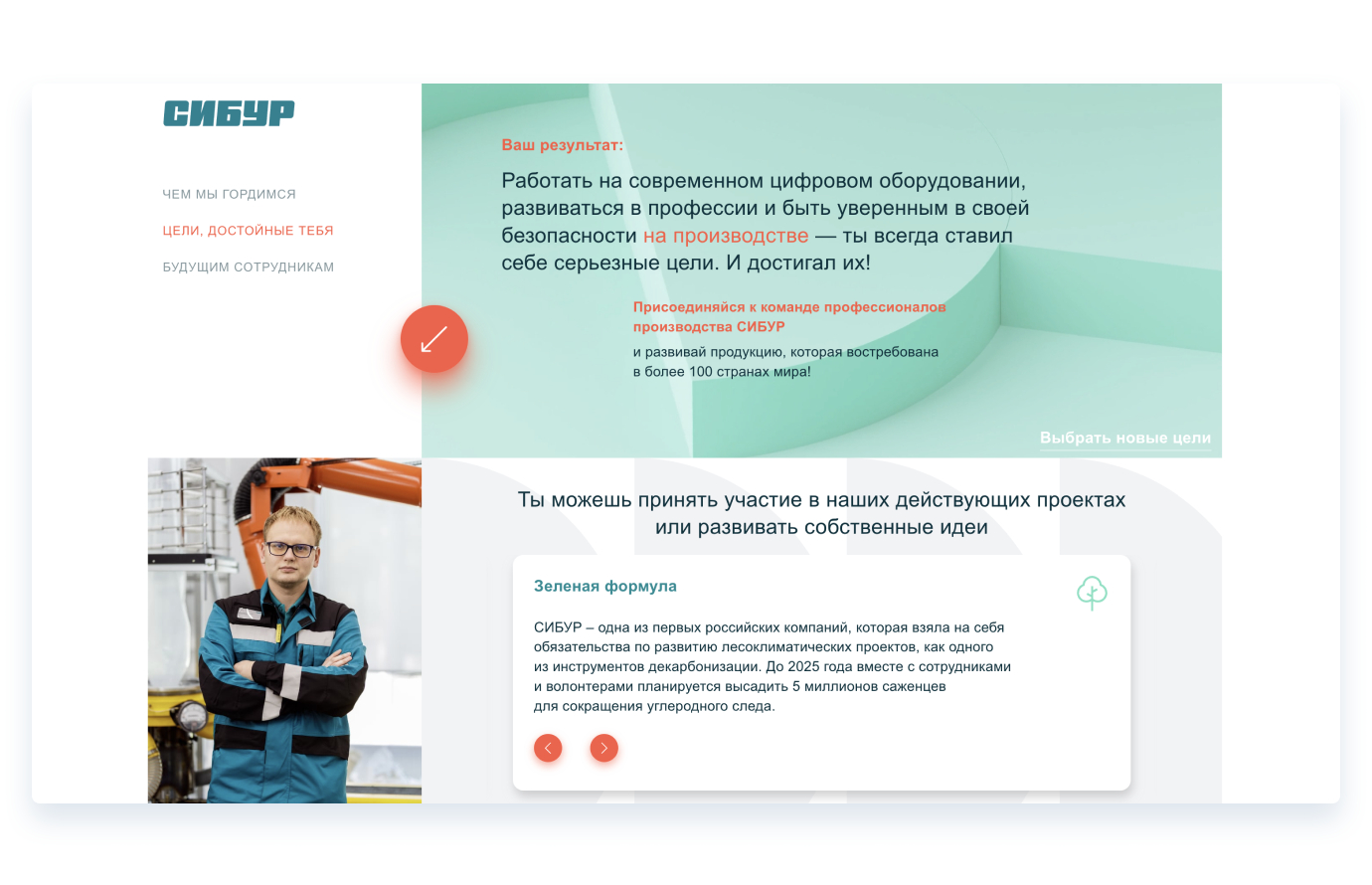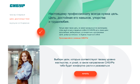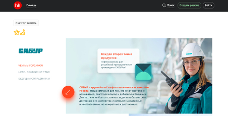Во-вторых, СИБУР вместе с Бренд-центром hh.ru первым запустил интерактивный тест для соискателей прямо на брендированной странице. В разделе «Цели, достойные тебя» любой пользователь может ответить на 4 простых вопроса, и компания предложит ему одно из направлений работы в СИБУРе. Ориентиры всё те же — производство, маркетинг и продажи, диджитал и карьера для молодых специалистов.
