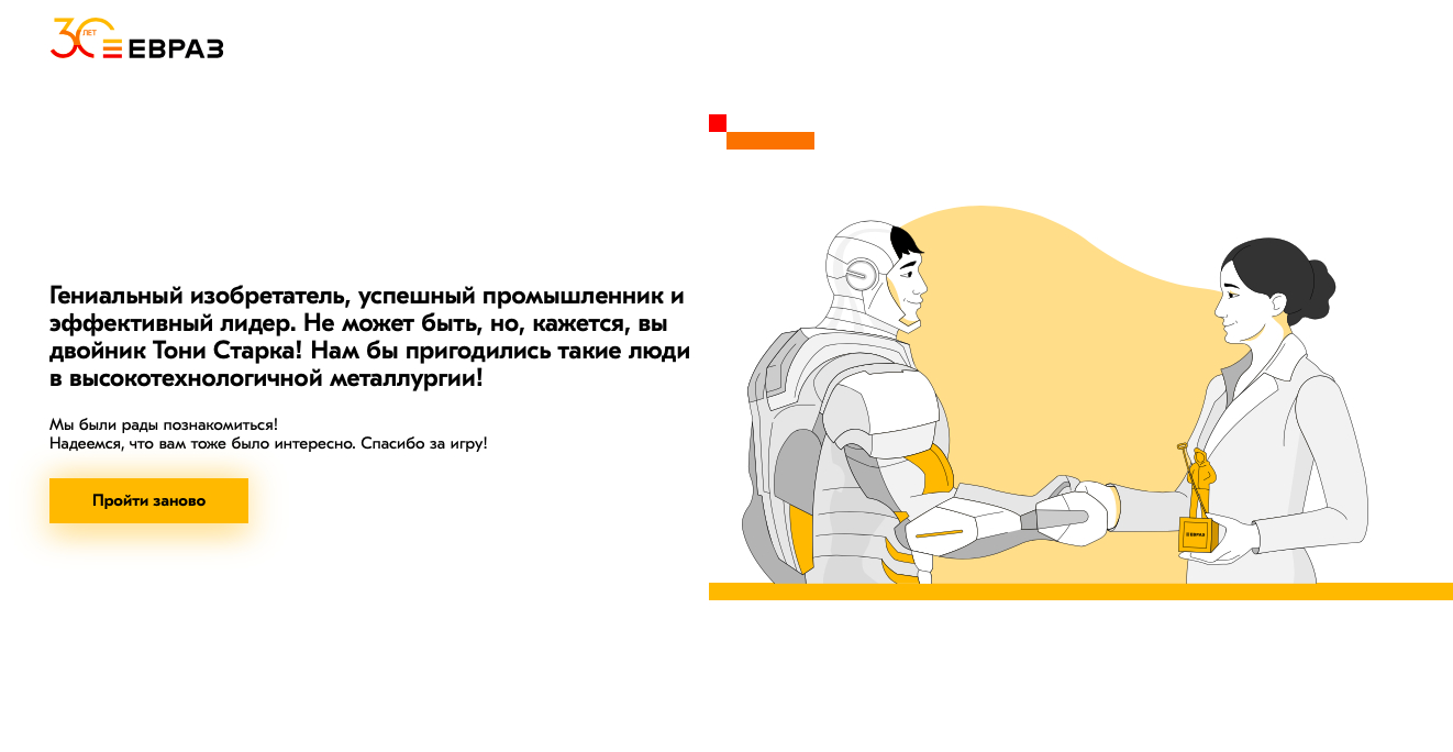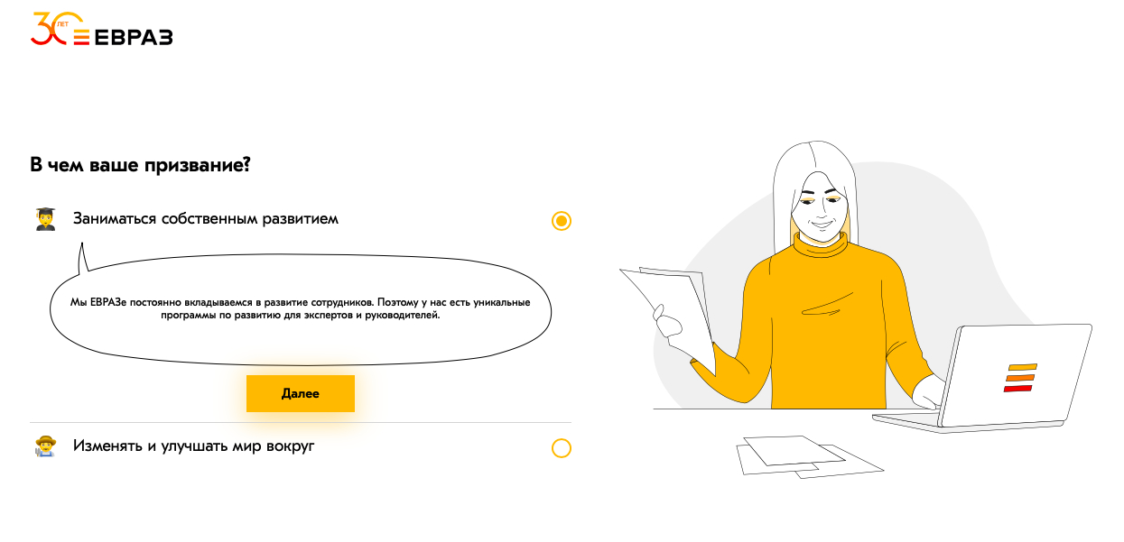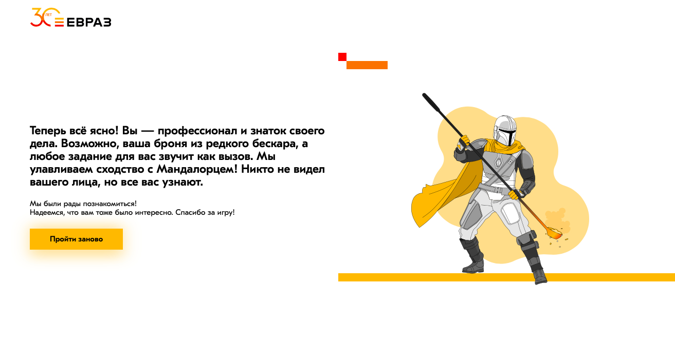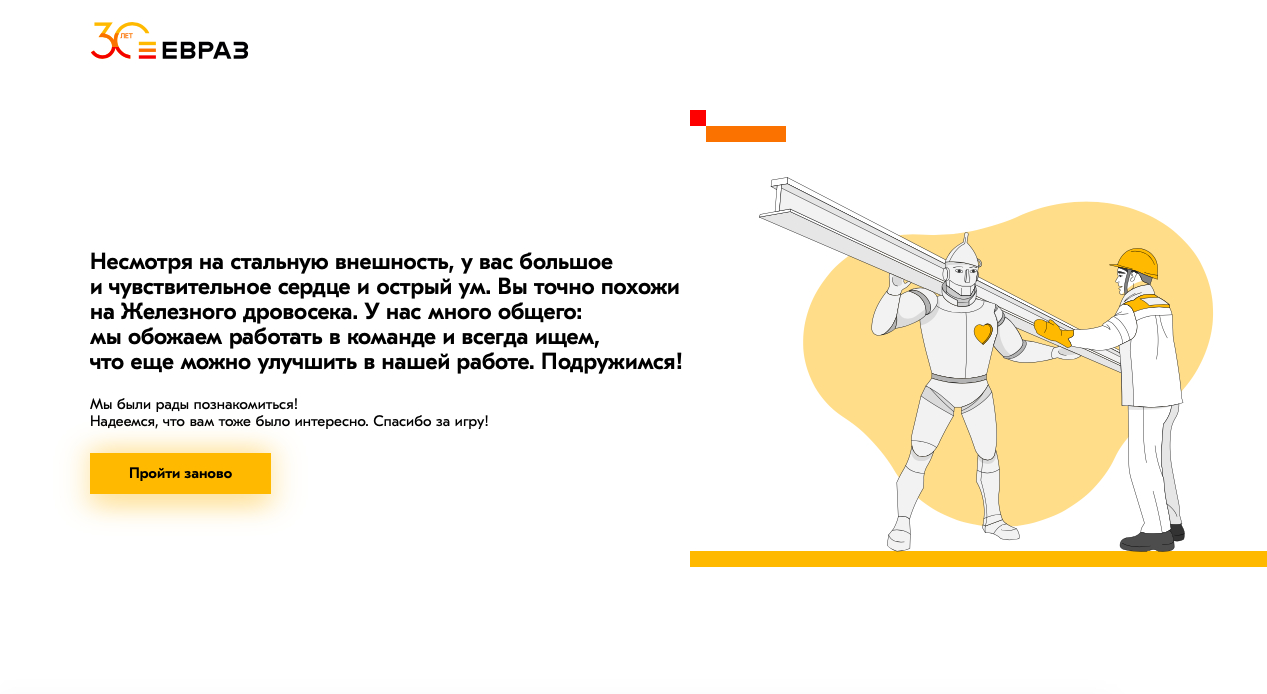 В конце теста игрок видит результат — портрет своего героя с небольшим комментарием от ЕВРАЗа. Остроумное описание персонажа вместе с призывом дружить и работать вместе бьют точно в цель — хочется пройти игру заново, а потом сразу отправить резюме.