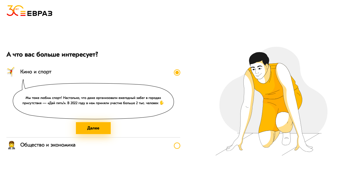 Опираясь на опыт прошлого года, специалисты Бренд-центра представили компании на выбор три идеи. Больше всего очков набрала самая простая активность — тест. Лёгкость, интерес, максимум эмоций за минимальное количество времени — то, на что делала ставку креативная команда в новом году. Она предложила ЕВРАЗу создать тест, который поможет кандидатам узнать чуть больше о себе, вдохновить на новые свершения и, конечно, найти много пересечений с компанией. Это важный момент, учитывая, что вовлекать в игру нужно было соискателей, которые далеки от металлургической отрасли.