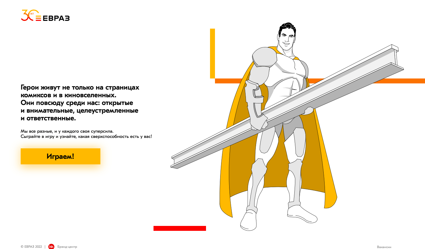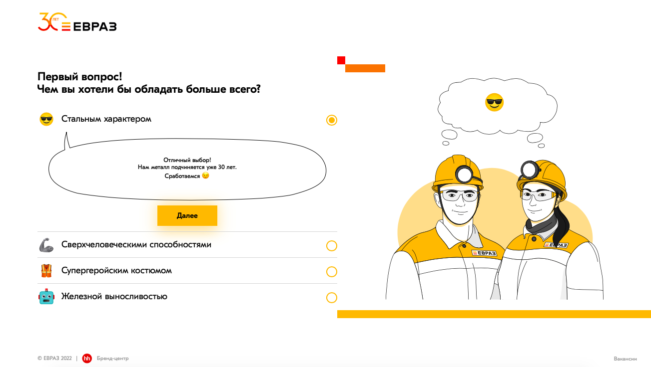 В это же время креативная команда Бренд-центра hh.ru разработала для ЕВРАЗа тест-игру «Вдохновляем делом». Спецпроект стал завершающим штрихом в новом портрете бренда работодателя. Он помог донести до кандидатов две ключевые идеи.