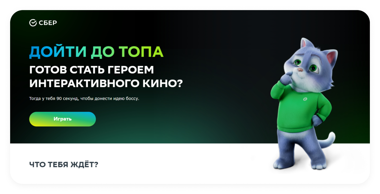 Идея понравилась нам своими драйвом и гибкостью: команда Бренд-центра hh.ru предложила новый для российского рынка формат, на который мы могли «нанизать» свои ценности, традиции и подходы к работе. То есть сделать такой проект, из которого, если убрать все логотипы, всё равно будет понятно — он про Сбер. На работе у нас вам тоже предстоит часто «играть от первого лица», сталкиваться с непростыми испытаниями, «прыгать выше головы» и даже представлять идеи напрямую топ-менеджерам — и в проекте нам удалось это наглядно показать.