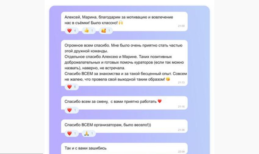 Всего же в офисе компании в одно из воскресений собрались 80 человек — актёры, операторы, организаторы, визажисты и каскадёры, которым предстоял полноценный рабочий день. И даже несмотря на то, что на весь организационный и творческий процесс «от и до» ушло примерно 13 часов, радость от понимания того, сколько всего проделано ради финальной картинки, и приятное предвкушение результата взяли верх.