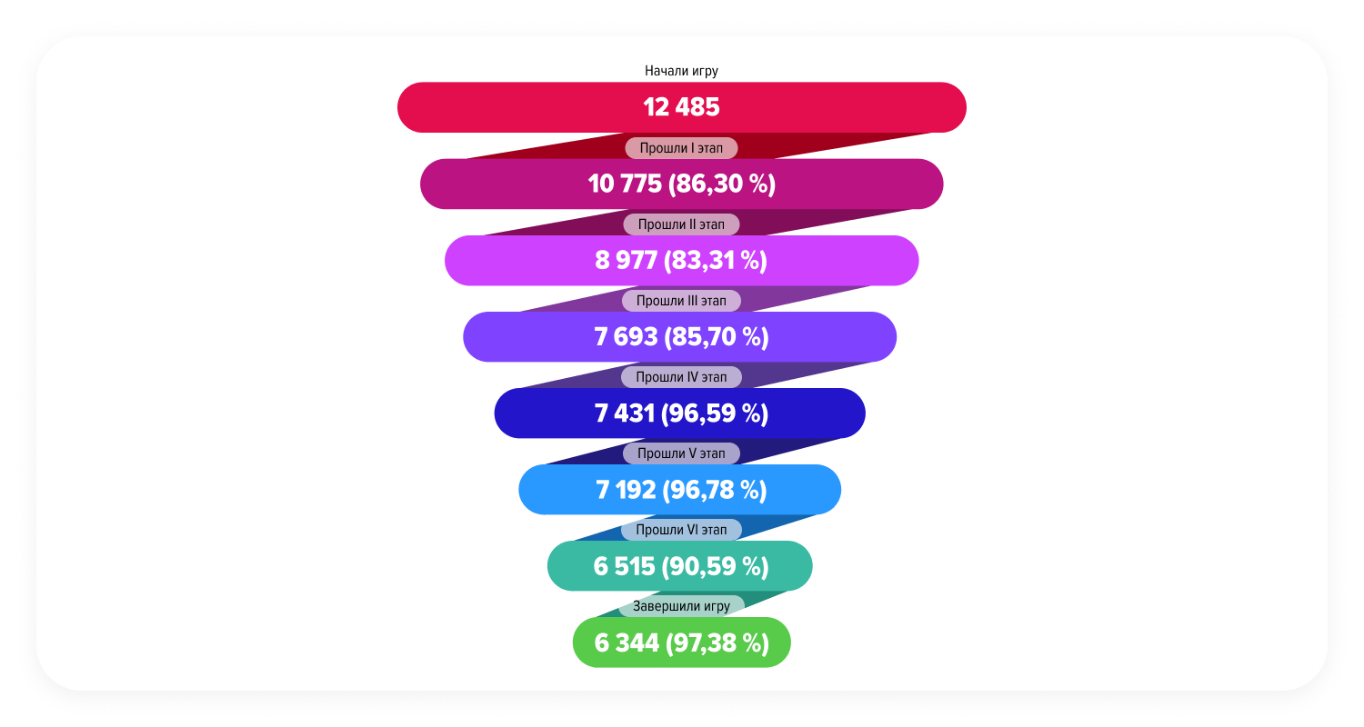 Скажем откровенно, задачи в игре не самые простые, к тому же их немало — целых 6. Но, кажется, многих это только ещё больше вдохновляло играть — 51% прошли всё, от начала и до конца. С каждым новым шагом (точнее, прыжком) интерес к событиям в игре возрастал. Это хорошо видно по воронке активности: