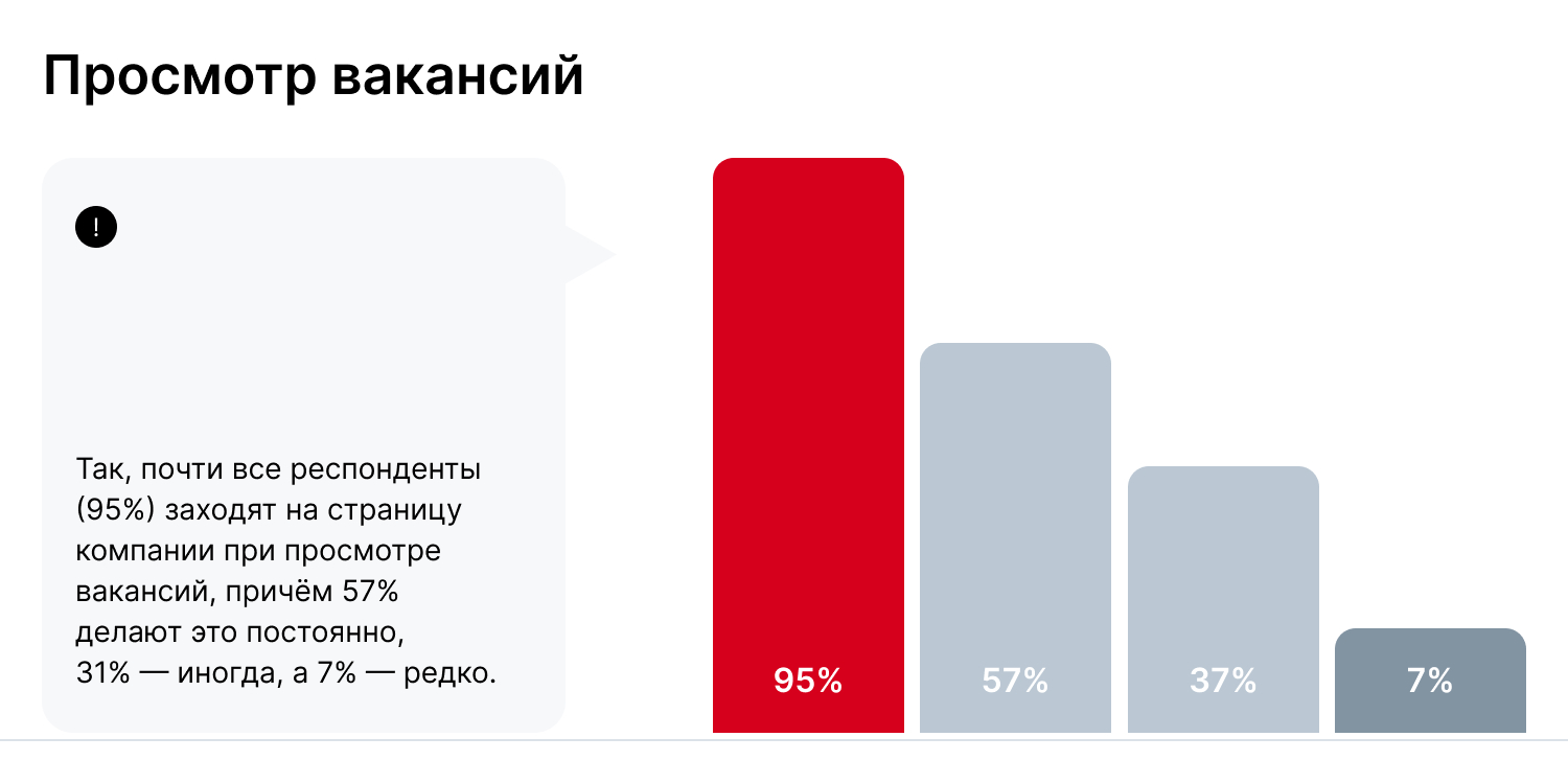 Наши аналитики сравнили результаты двух исследований и выяснили, что за 3 года страница компании стала более значимой для соискателей. Так, почти все респонденты (95%) заходят на страницу компании при просмотре вакансий, причём 57% делают это постоянно, 31% — иногда, а 7% — редко.
