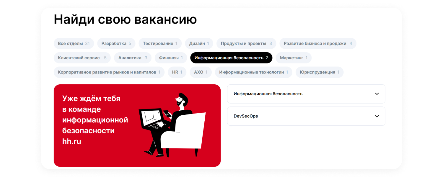 Ещё один фактор, позволяющий получать больше откликов — удобство поиска по вакансиям. На странице компании можно увидеть сразу все открытые вакансии, которые отсортированы по направлениям.