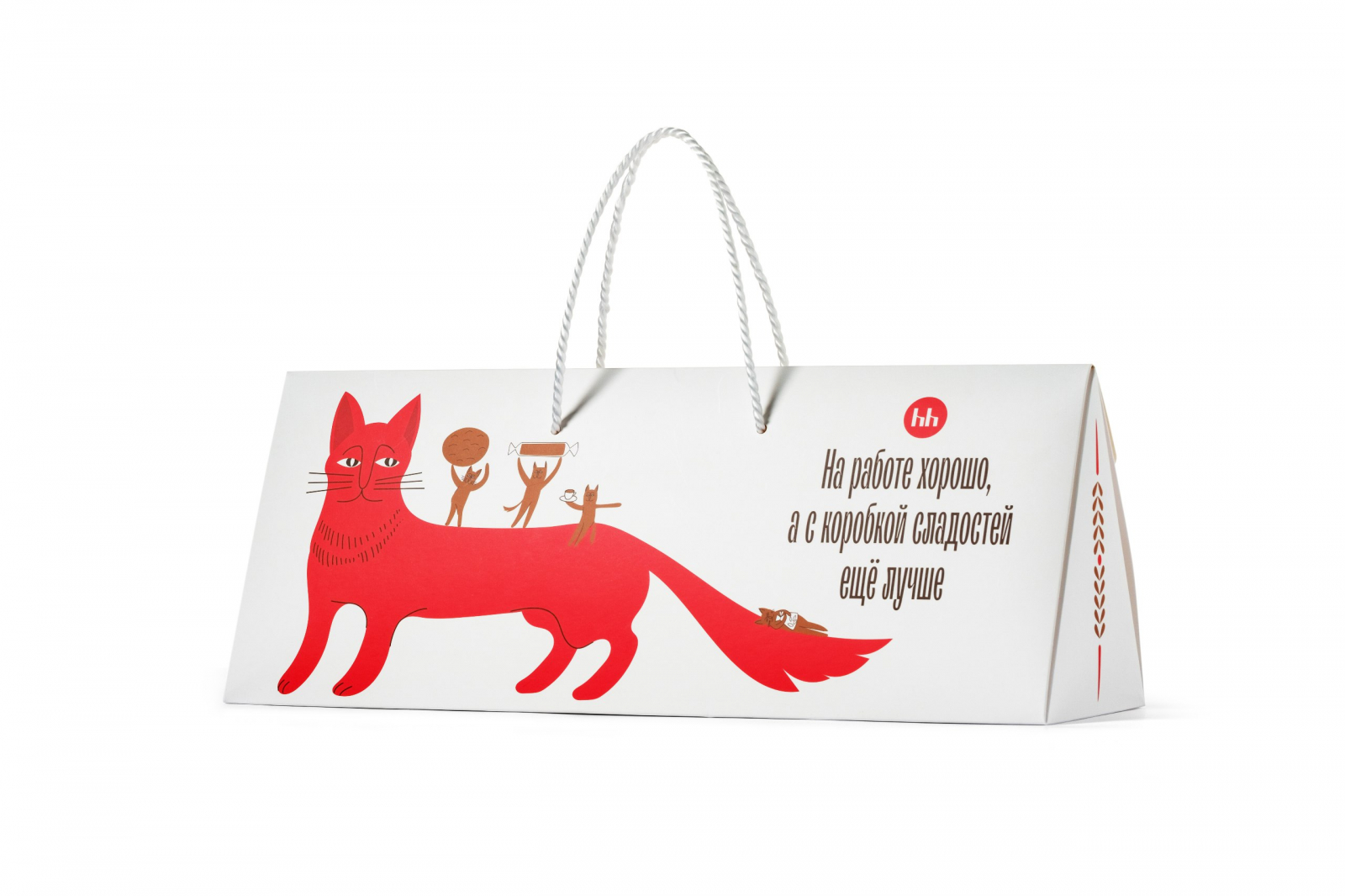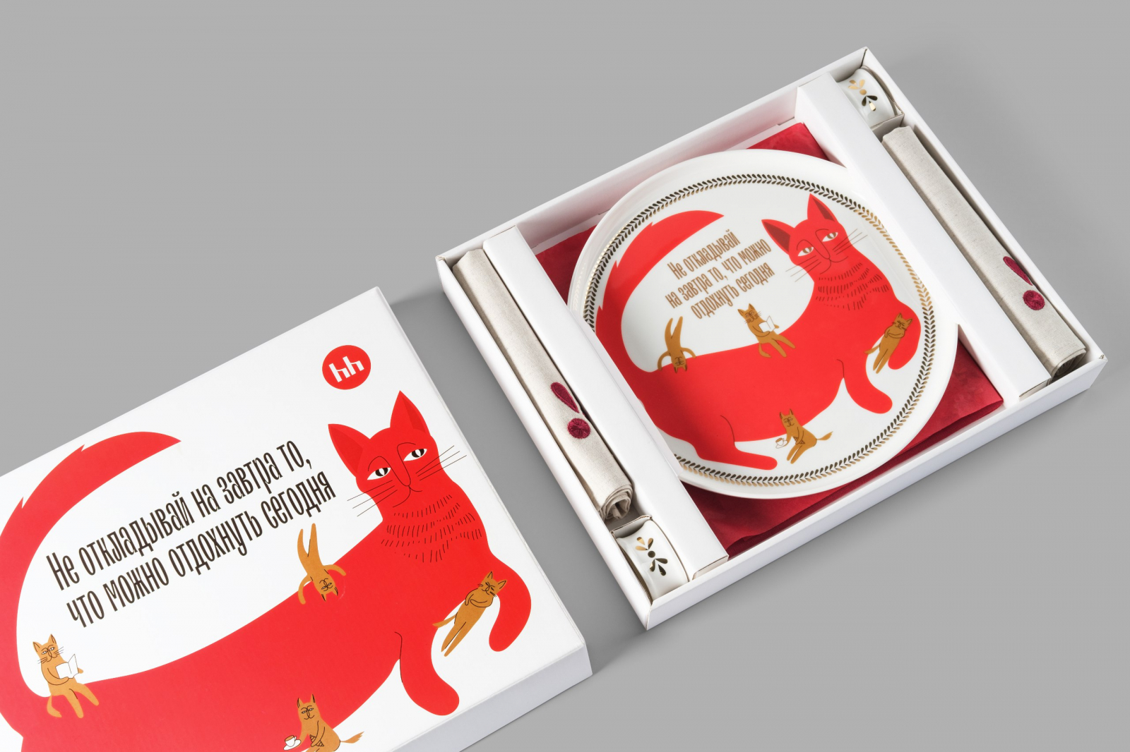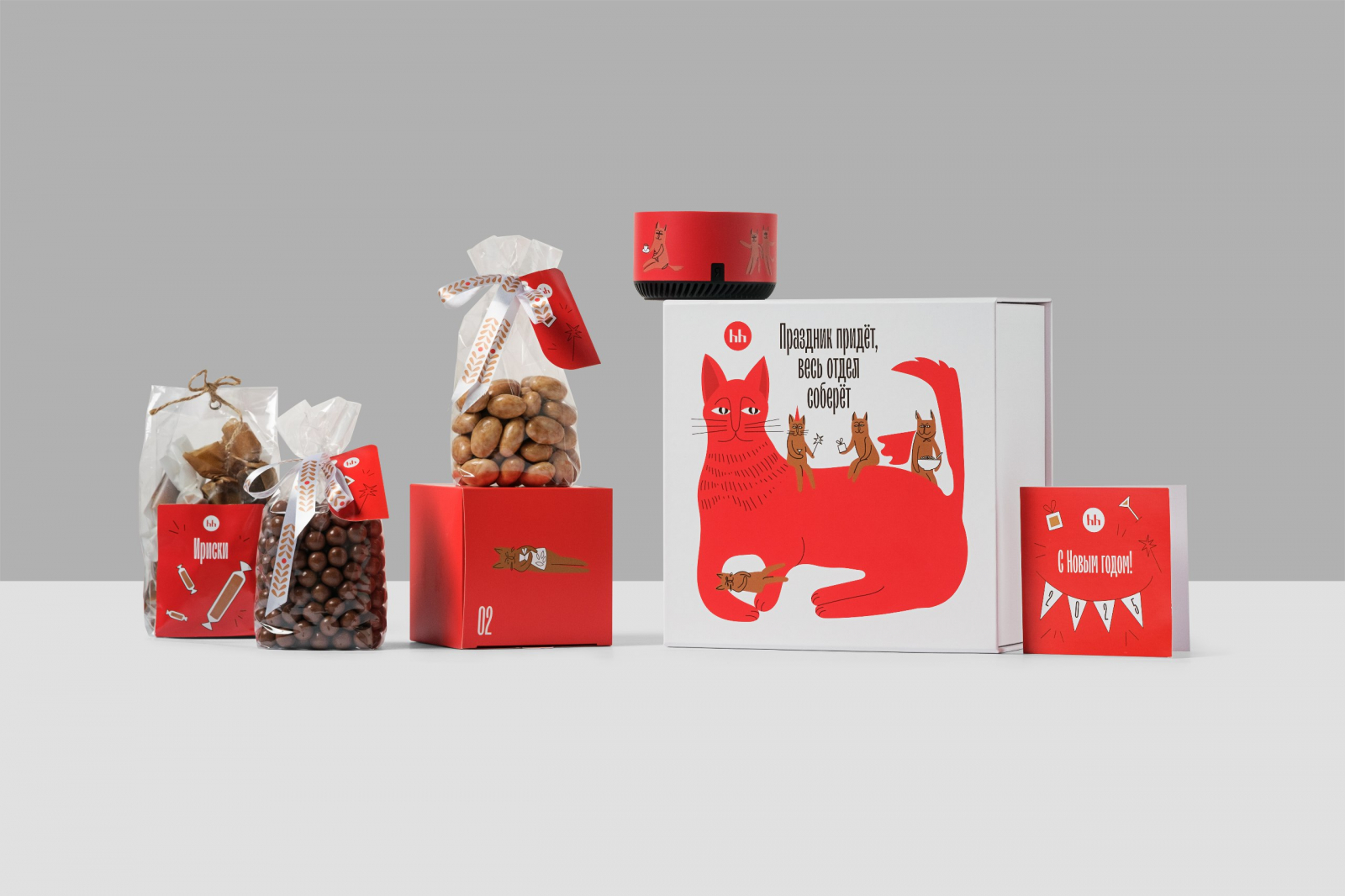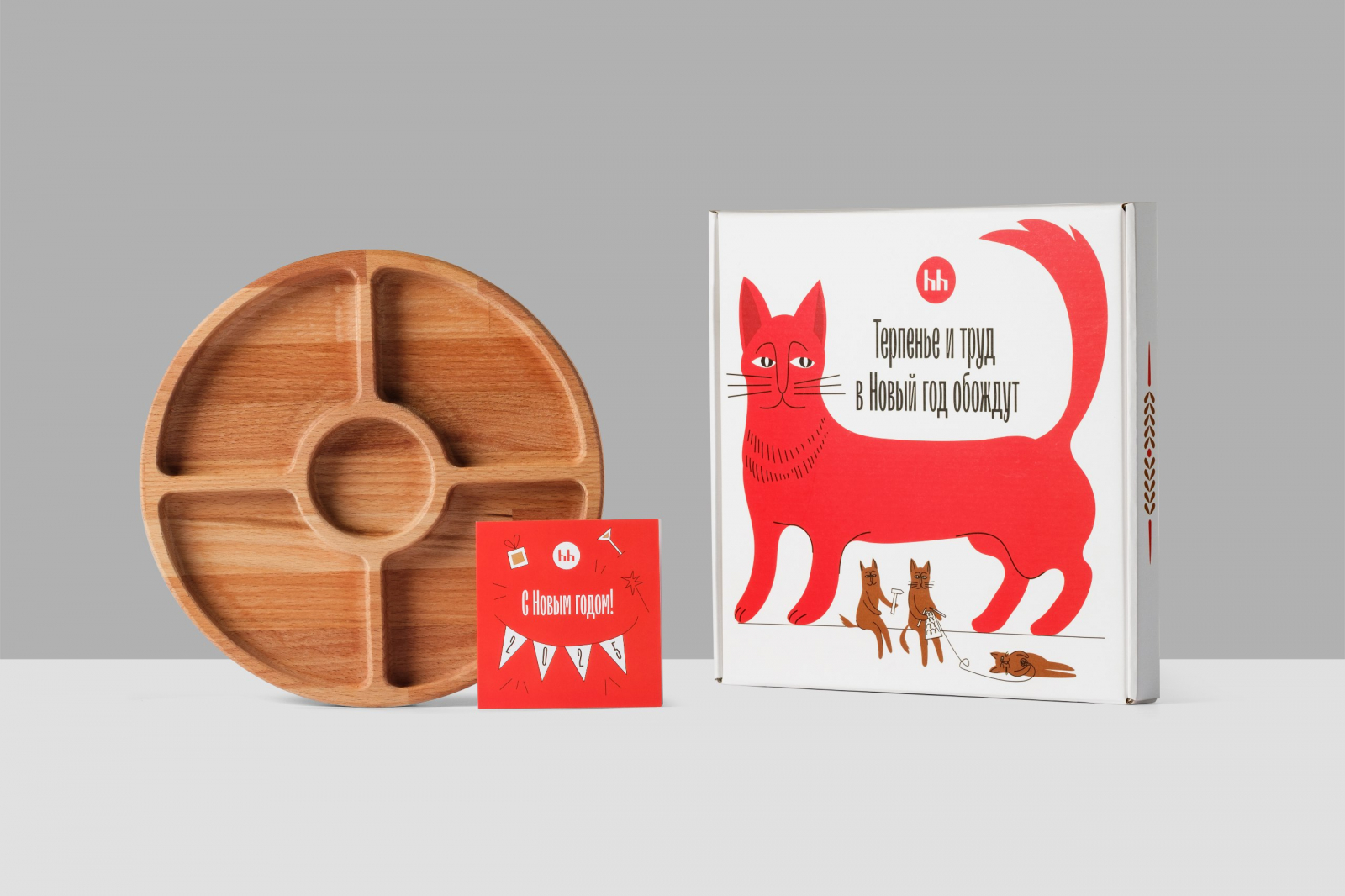 Новый год и hh.ru стали поистине народными символами. Как Новый год ассоциируется с главным праздником, так и hh.ru стал нарицательным именем в сфере поиска работы. Дизайн подарочных наборов сосредоточен вокруг кота — народного символа домашнего уюта. Специально для этого проекта мы поменяли логотип hh и сделали его ещё более народным.