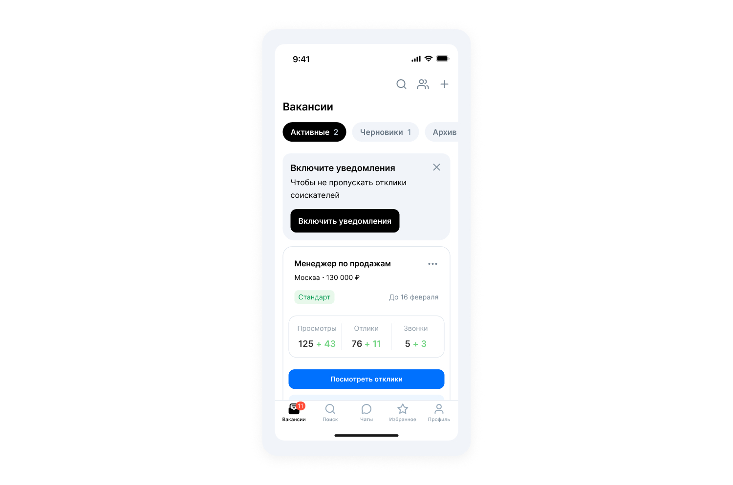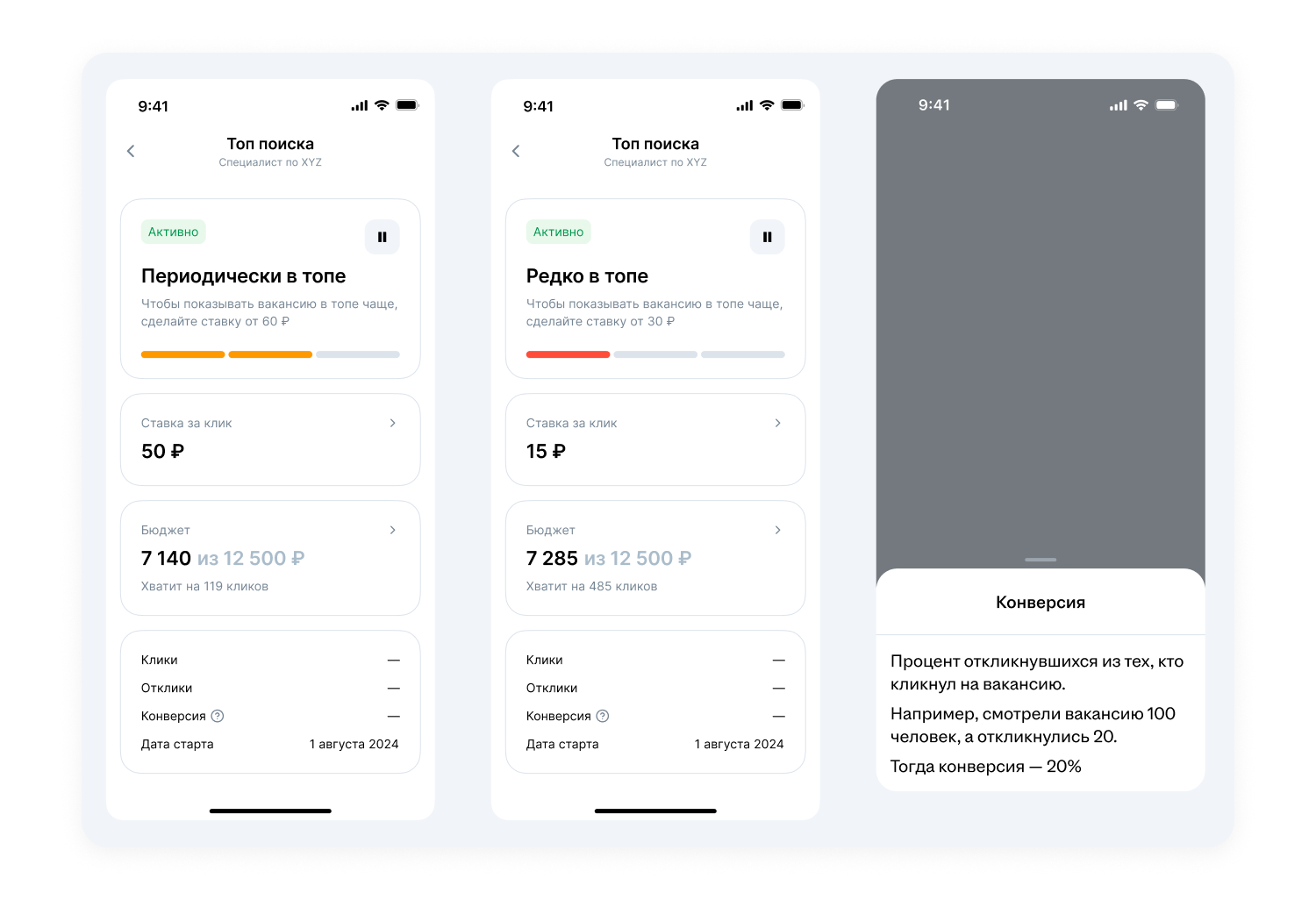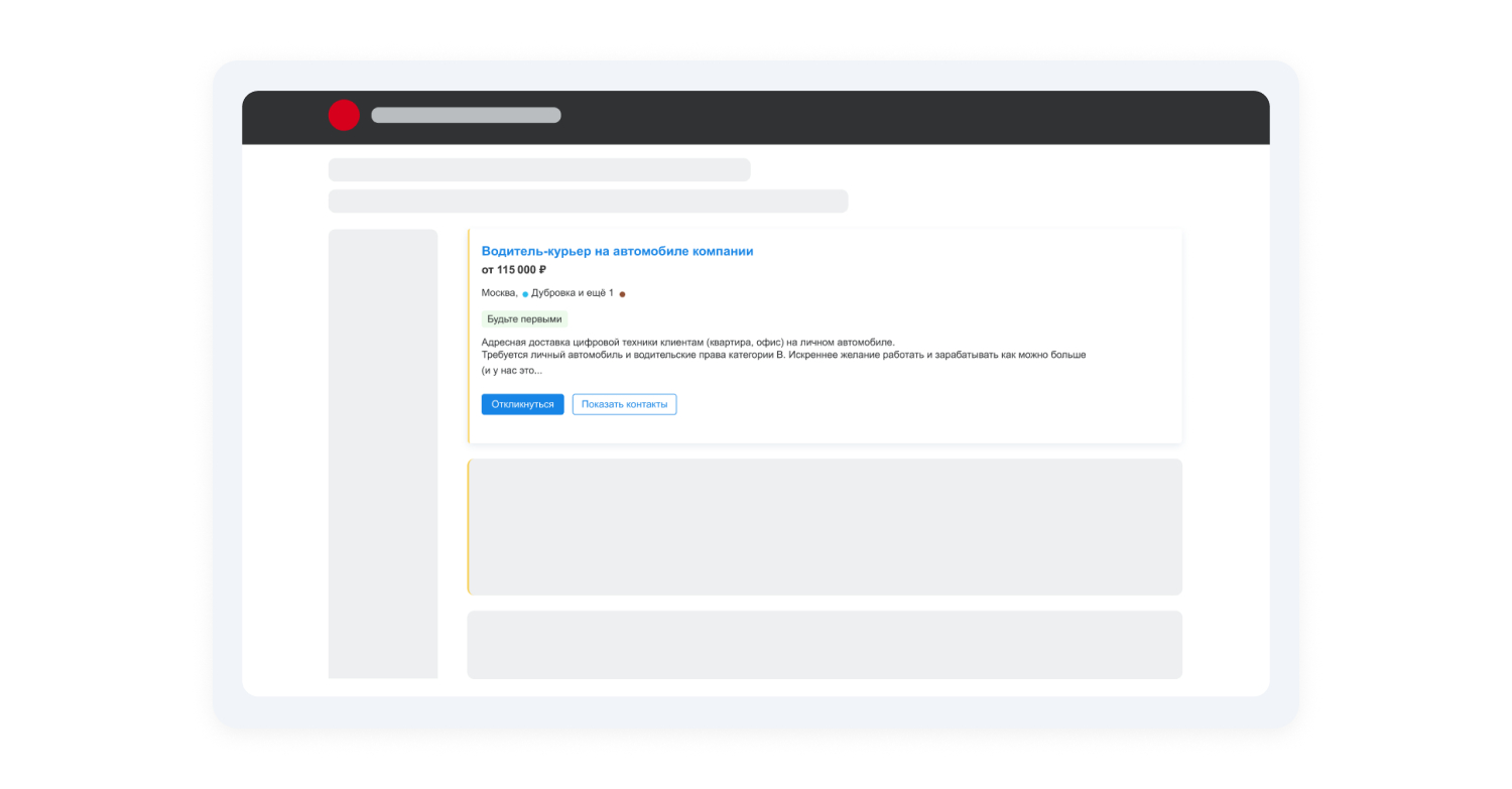 Алгоритмы покажут вакансию тем, у кого есть релевантный опыт в резюме и открыты похожие объявления. Чтобы попасть в топ поиска, достаточно указать ставку за клик и бюджет кампании. Инструмент поможет быстрее привлечь подходящих соискателей в конкурентных нишах найма и собрать отклики за короткое время.