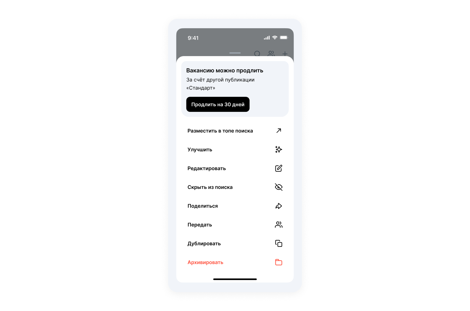 В приложении вы также можете отслеживать статистику продвижения. Для этого перейдите в раздел «Вакансии», выберите объявление с продвижением в топе поиска, нажмите три точки и «К размещению в топе поиска». Здесь можно отредактировать рекламную кампанию и посмотреть статистику.