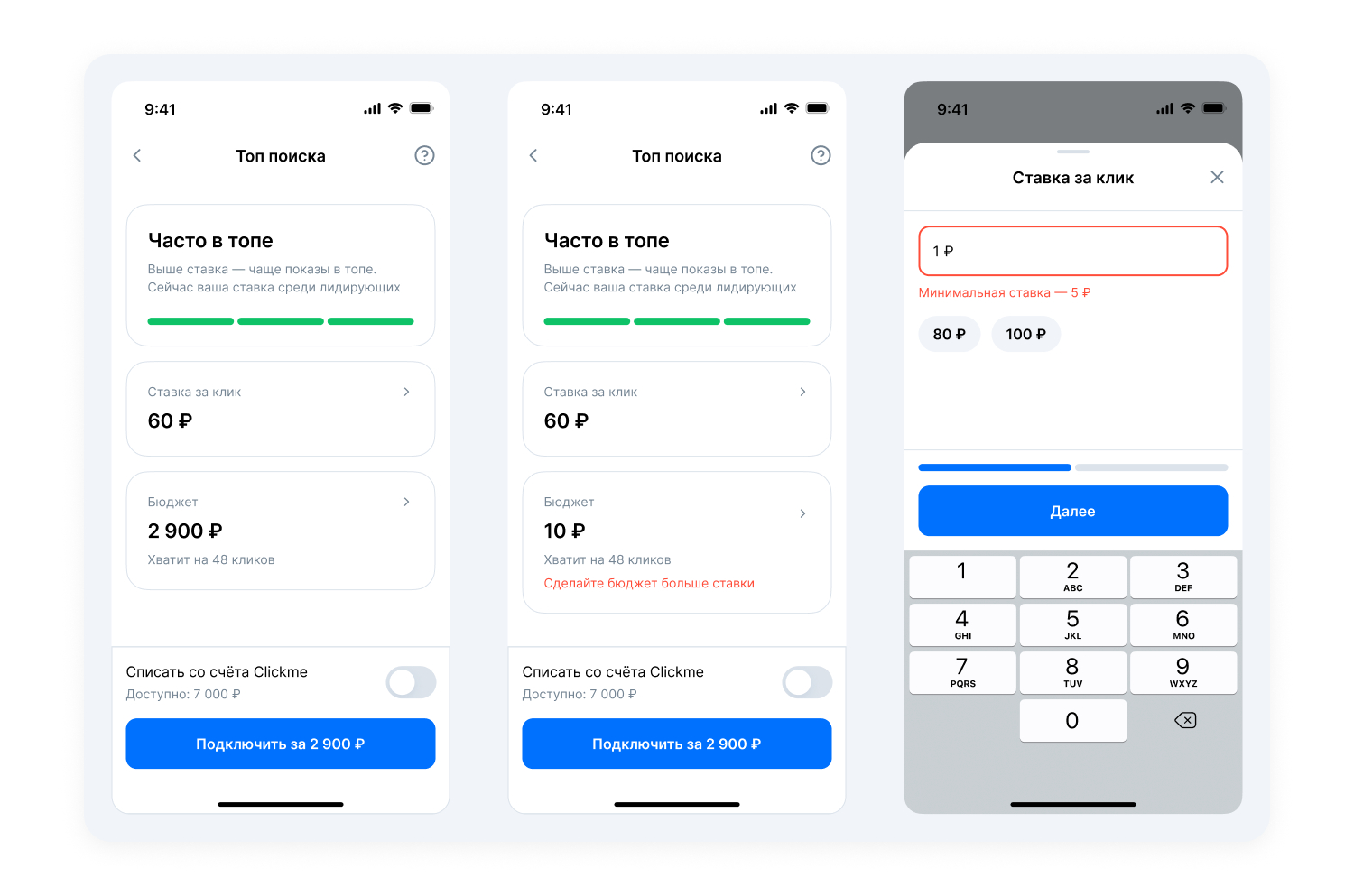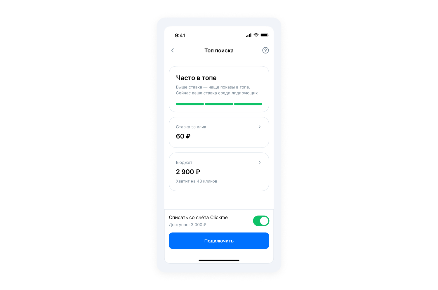 Пополните счёт заранее, чтобы была возможность оплатить продвижение. Сделать это можно в разделе «Профиль» → «Отложенные заказы». При запуске кампании вы увидите доступную сумму над кнопкой «Подключить».