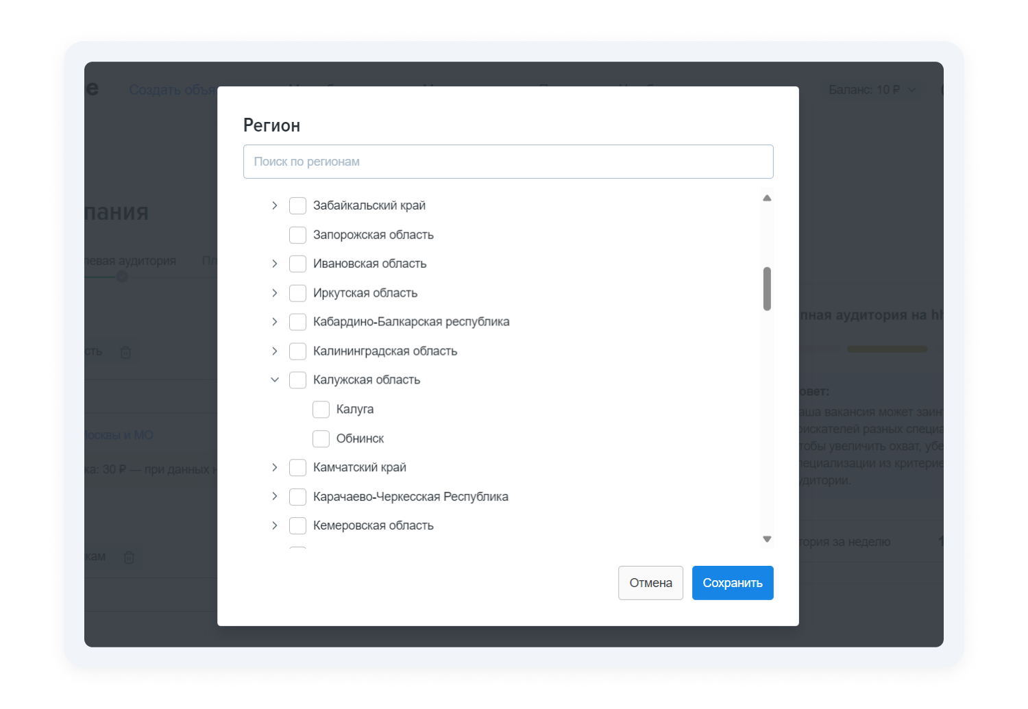 Если хотите указать регион целиком, поставьте галочку напротив. Для более точного таргетинга укажите отдельные населённые пункты.