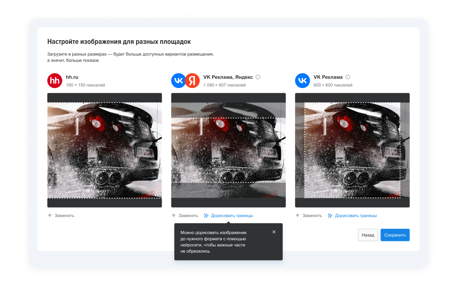 А ещё теперь вы можете загрузить своё изображение и дорисовать границы с помощью нейросети. Так получится сохранить важные части картинки, даже если площадка просит файл в другом разрешении.