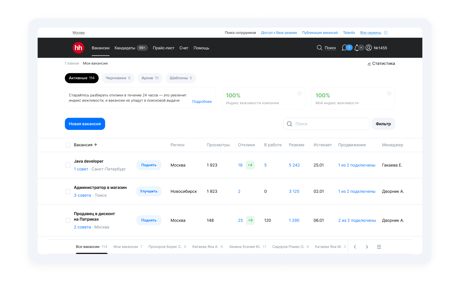 Команда не стала откладывать удобство пользователей в долгий ящик, поэтому сразу добавила возможность управлять инструментом в приложении hh бизнес. Благодаря этому вы можете запустить продвижение вакансии в любом месте: по дороге на работу, в магазине или даже на острове с доступом к интернету. Не обязательно открывать ноутбук или заходить в личный кабинет работодателя через браузер.