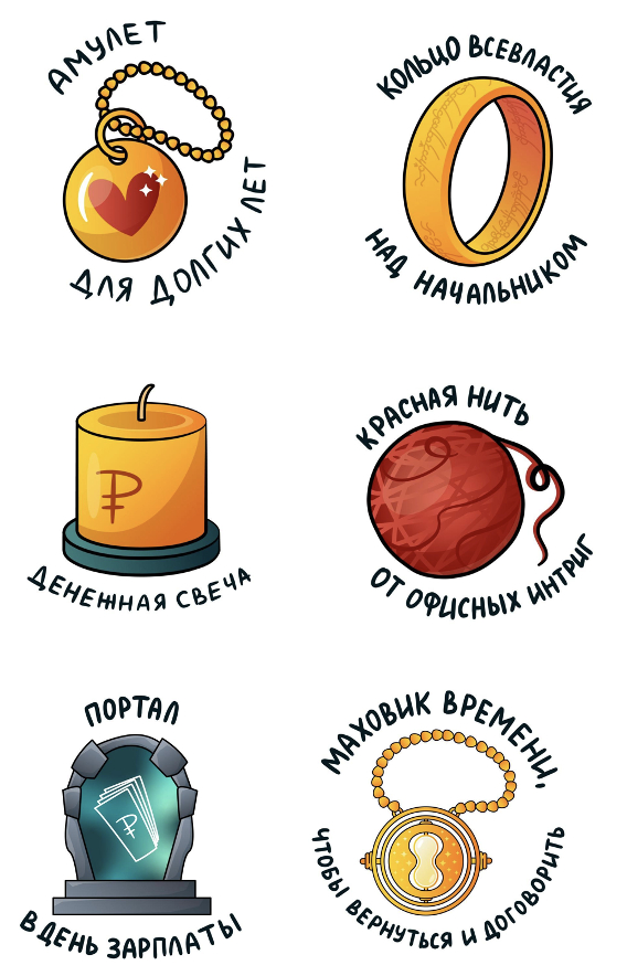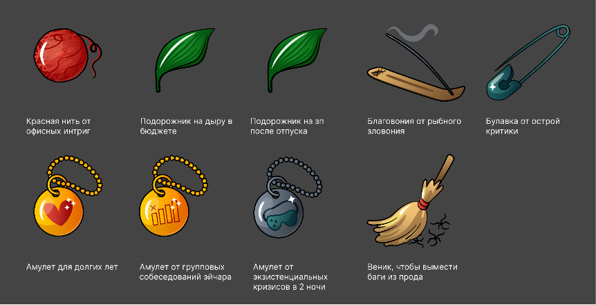 Придумали больше 80 оберегов. При выборе названий и образов не боялись иронизировать, поэтому обереги отсылают к жизненным ситуациям современных специалистов и к традиционной, популярной и мифологической культурам. Например, в рандомайзере может выпасть «Кольцо всевластия в ночь перед дедлайном» — так одновременно затрагивается проблема горящих сроков и есть отсылка к вселенной книг Дж. Р. Р. Толкина.