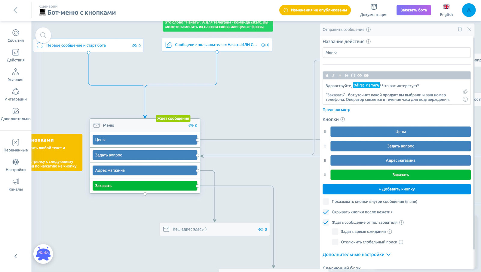 В конструкторе ботов вы можете самостоятельно настраивать нужный функционал, например, меню, выдачу промокода, выгрузку данных в google-таблицы или интеграцию с CRM.