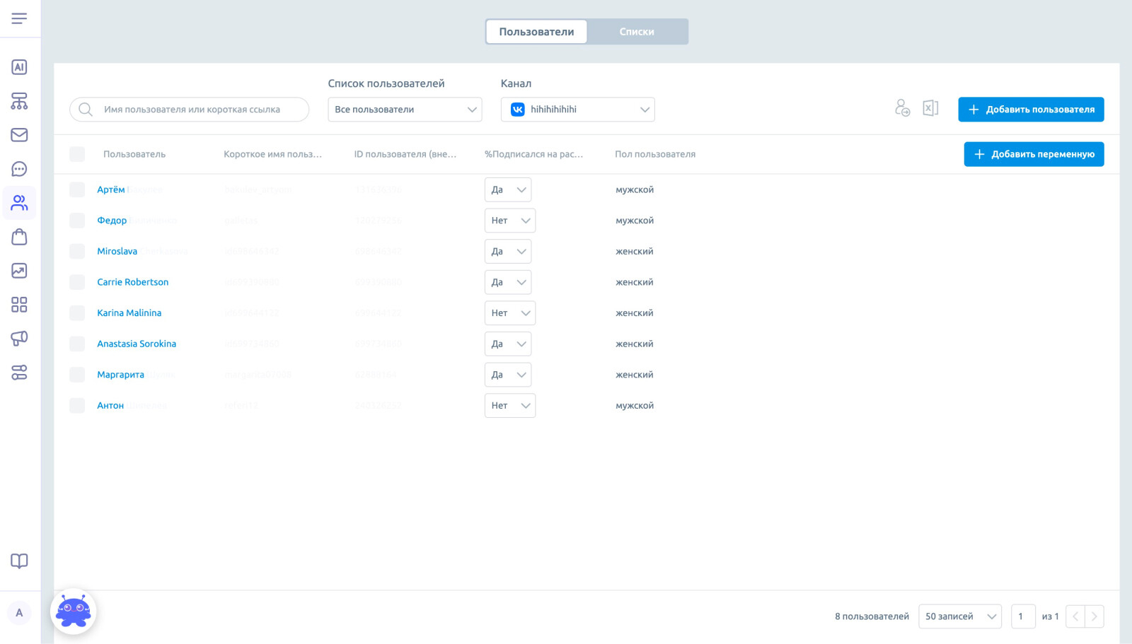 Все пользователи, которые взаимодействовали с чат-ботом, автоматически сохраняются в базу подписчиков в сервисе. Также вы можете подключить интеграцию с вашей CRM и выгружать туда лидов из базы Smartbot. Звучит сложно, но настраивается одной кнопкой.