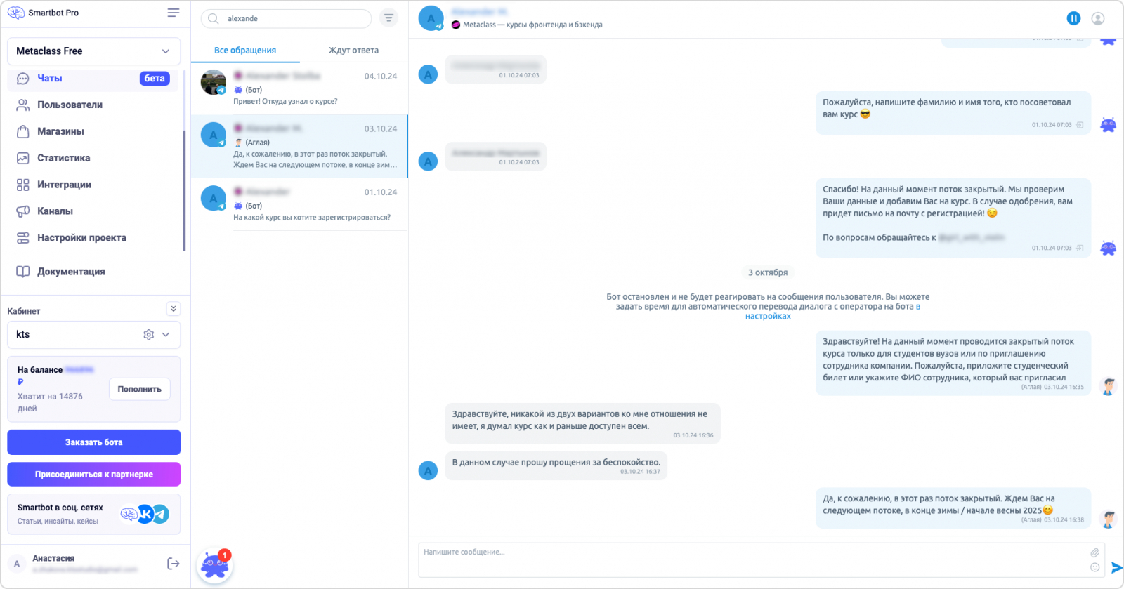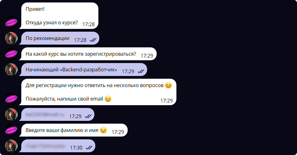 Чат-бот помогает Metaclass автоматически сегментировать аудиторию и экономит время администратору: ей не нужно просматривать сотни заявок и вручную отбирать тех, кто пришёл по рекомендации.