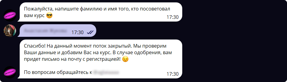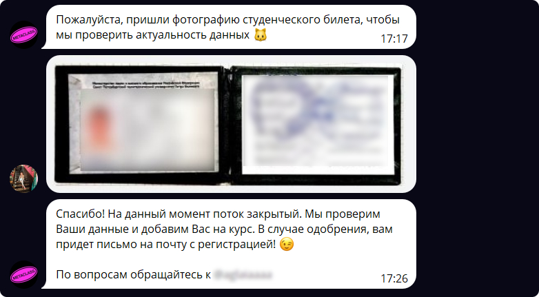 Например, в октябре этого года школа Metaclass запустила закрытый курс для студентов МГТУ им. Н. Э. Баумана и Московского Политехнического университета. В бот добавили новую ветку сценария: при регистрации студенты указывают, что они узнали о курсе из чата своего вуза и оставляют контакты. Для подтверждения чат-бот предлагает отправить фото студенческого билета.