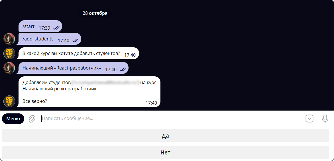 «На закрытый курс зарегистрировалось 250 человек. Если бы не бот, администратору нужно было бы скопировать почту каждого студента, зайти на обучающую платформу, внести email в специальную форму и подтвердить отправку. А потом ещё вернуться в таблицу и проставить отметку. Это 2—3 часа монотонной работы. А в боте она запускает команду — и сотня писем уходит автоматически»