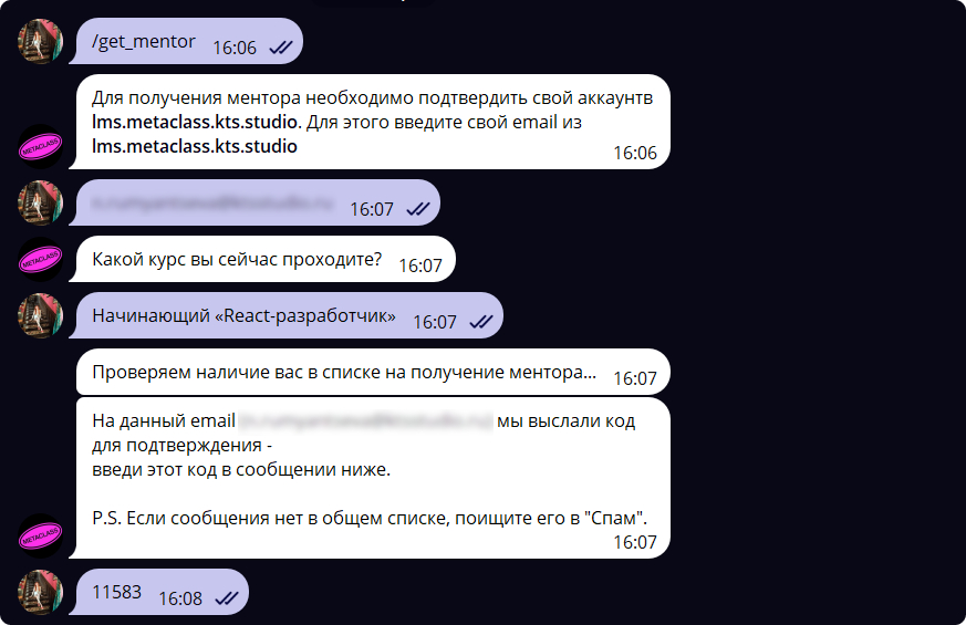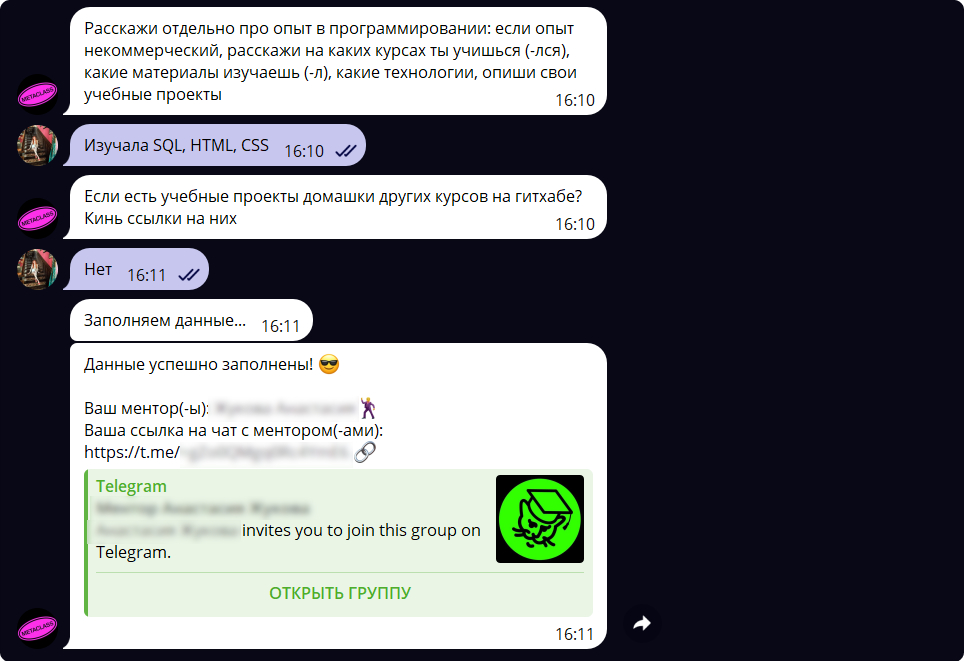 Когда пользователь ответит на все вопросы, бот отправляет ему ссылку на чат с ментором.