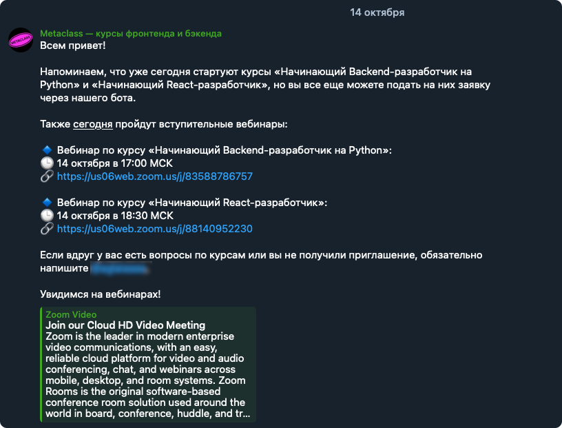 Ещё одна функция бота — информирование студентов. Например, кураторы школы напоминают о старте курса, делают рассылки с анонсами вебинаров и отправляют записи эфиров.