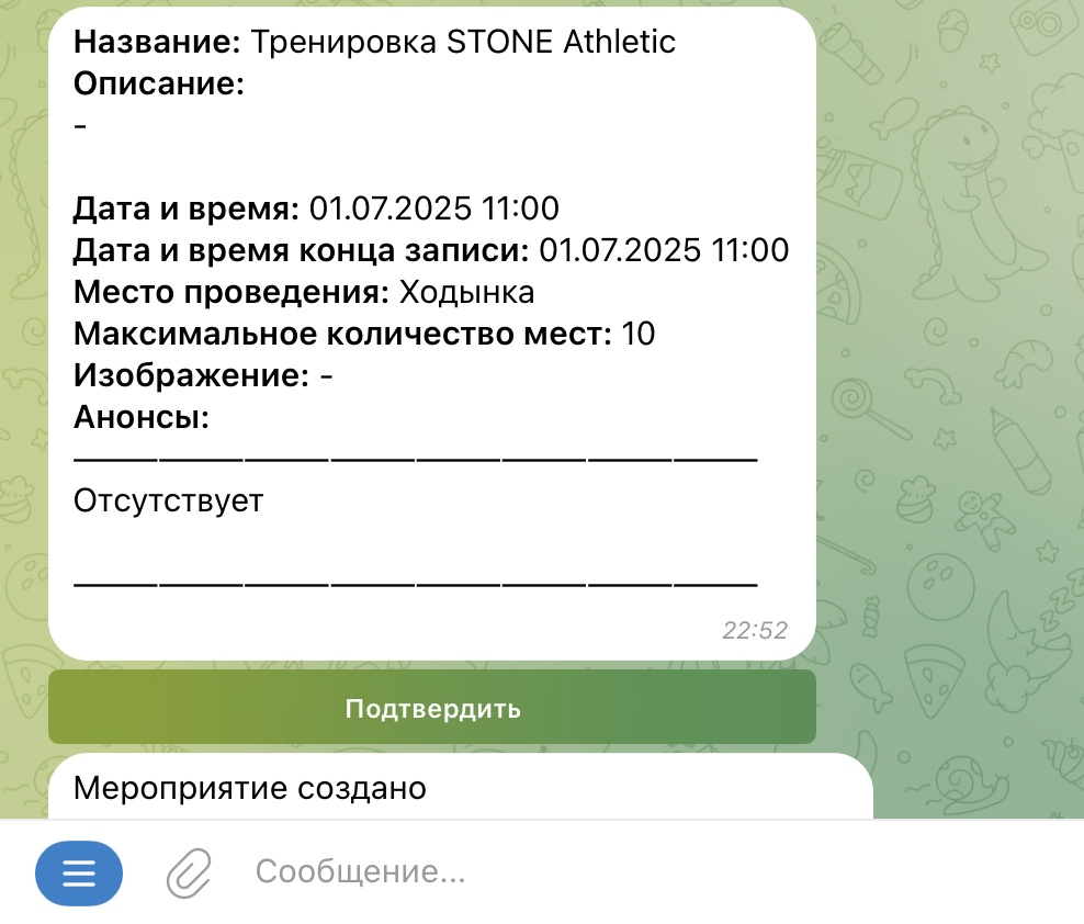 Бот девелопера коммерческой и жилой недвижимости STONE. Компания регулярно проводит мероприятия для брокеров, например, тренировки или вебинары. Чтобы участникам было проще записываться на ивенты, мы создали чат-бота в Telegram.