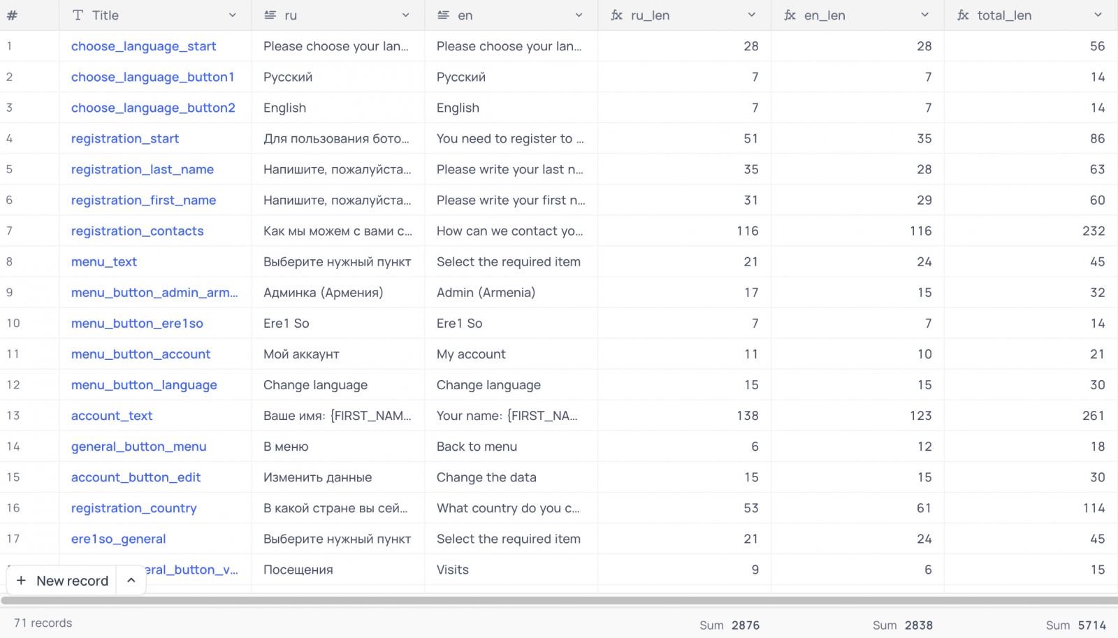 «Высокая производительность NocoDB позволяет нам быстро масштабировать количество языков и обеспечивать стабильную работу бота. Пару лет назад мы собирали подобного бота для себя и хранили тексты в Google-таблицах. Из-за этого бот отвечал с задержкой 3-5 секунд и его было сложно масштабировать»