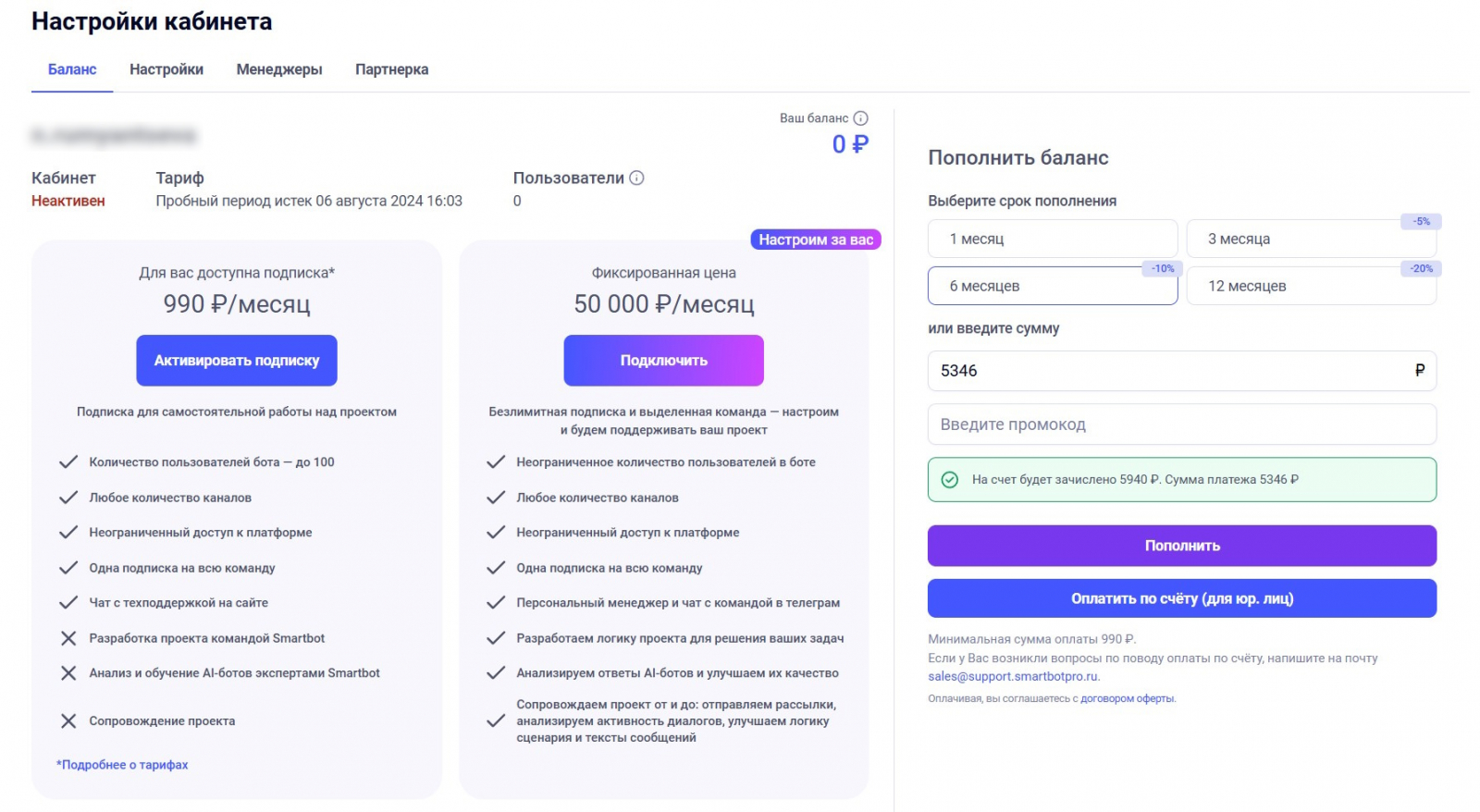2. После авторизации вы перейдёте в личный кабинет. Выберите тариф и оплатите его.