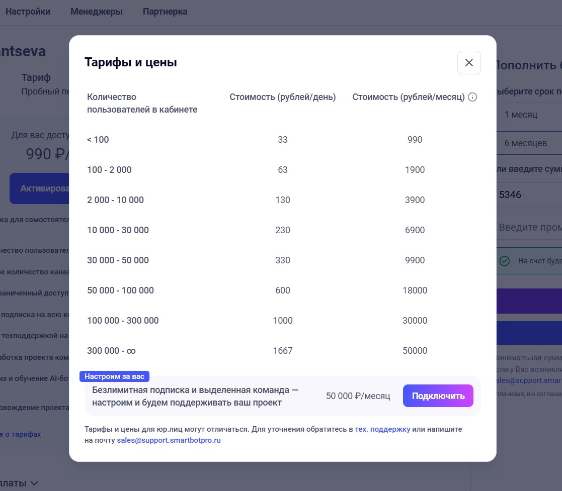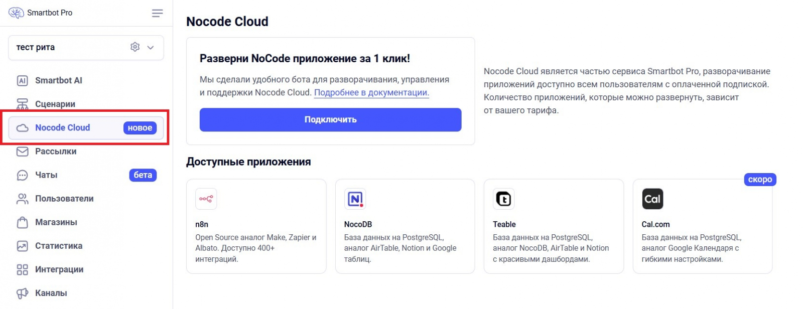 Сервисы входят в хостинг Nocode Cloud. Его стоимость уже включена в текущие тарифы Smartbot Pro. Например, по подписке за 990 рублей в месяц доступен один сервис на выбор — n8n, NocoDB или Teable с уровнем нагрузки до 20 запросов в секунду.