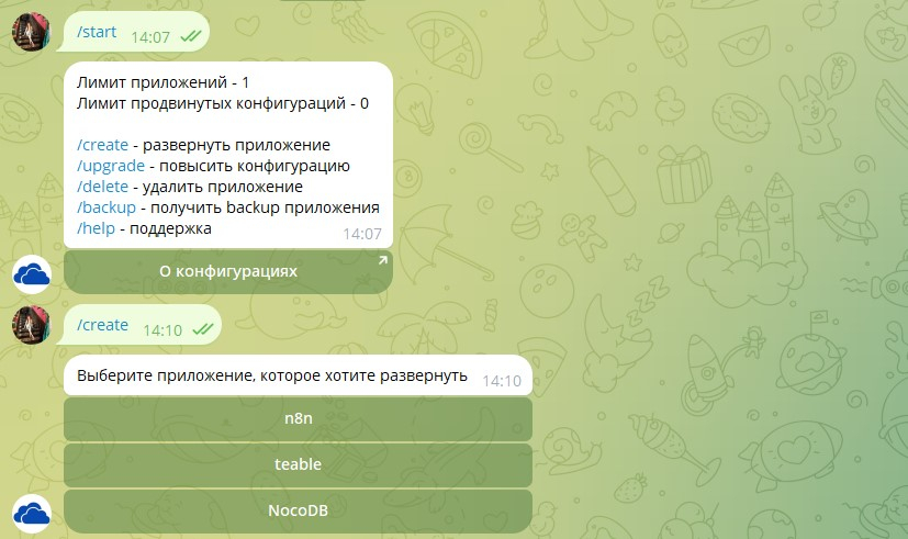 4. После вы автоматически перейдёте в Telegram-бота. Он покажет лимит приложений, которые доступны для вашего тарифа. Выберите сервис, который вам нужен.