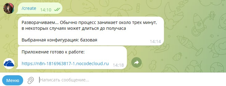 6. После выбора конфигурации бот автоматически развернёт сервис и пришлёт ссылку. Перейдите по ней и зарегистрируйтесь.