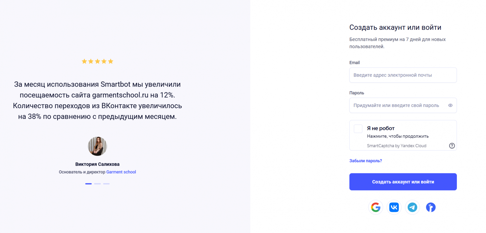 1. Зарегистрируйтесь в Smartbot Pro. Внесите email и придумайте пароль. Вы можете бесплатно тестировать все возможности конструктора в течение 7 дней.