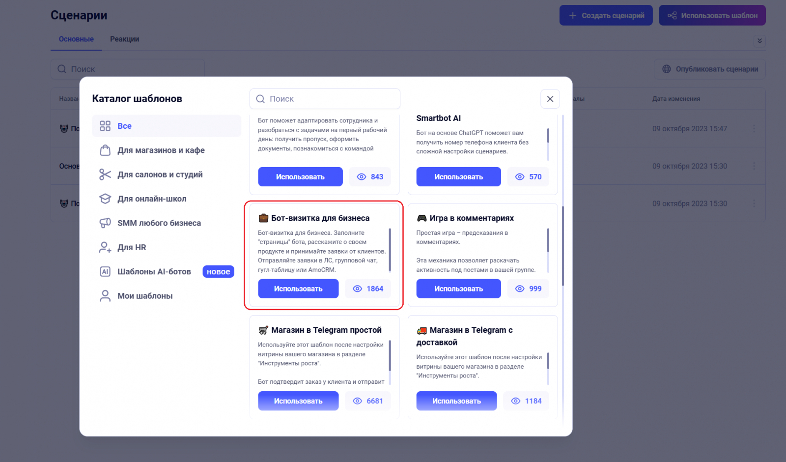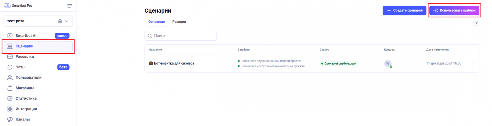 2. Выберите шаблон сценария. На главной странице в боковом меню нажимаем «Сценарии», затем «Использовать шаблон».