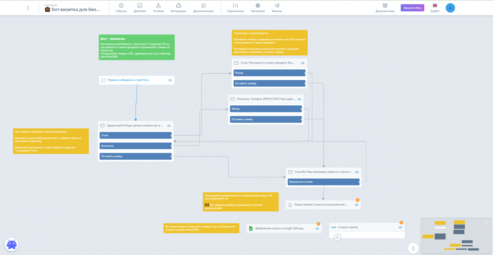 Для примера возьмём «Бот-визитка для бизнеса». В этом сценарии пользователи могут узнать о компании, познакомиться с продуктом и сделать заказ.
