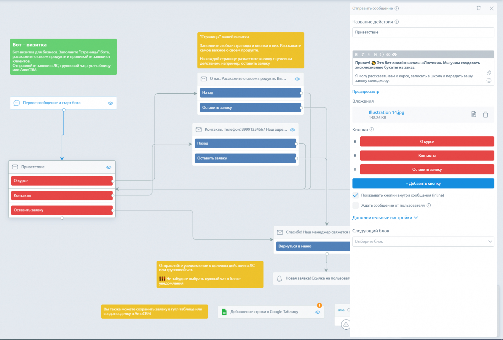 Допустим, у нас будет онлайн-школа флористики «Лютики», в которой учатся составлять букеты на заказ. В боте пользователь получает приветственное сообщение, может познакомиться с курсом и оставить заявку.