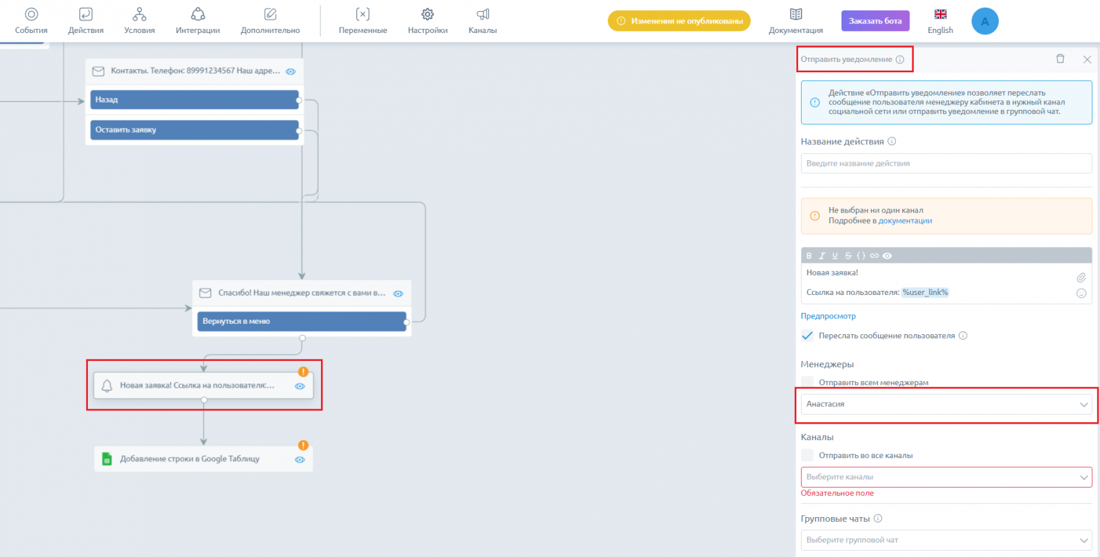 Для этого нажимаем на блок с текстом «Новая заявка…», он относится к типу действий бота «Отправить уведомление». Заполняем необходимые поля в настройках: выбираем сотрудника и создаём канал, куда будет писать бот.