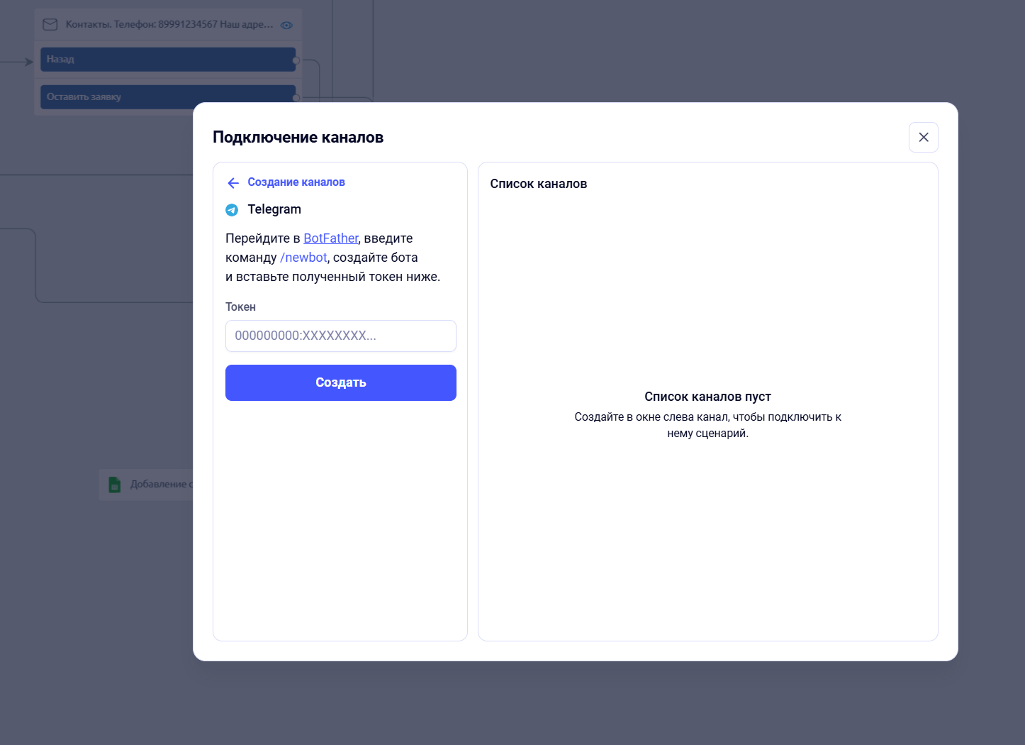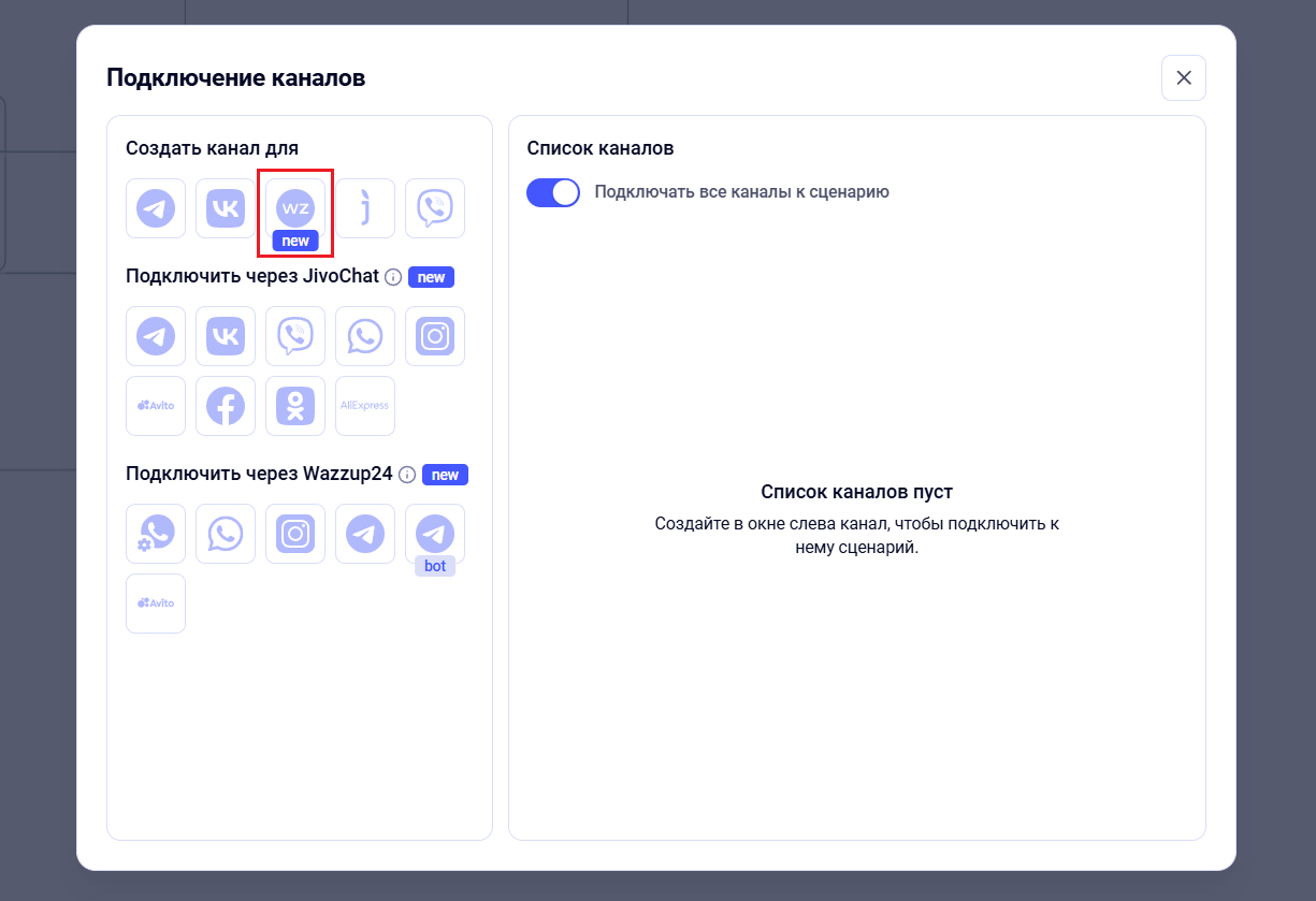Вернитесь в сценарий бота в Smartbot Pro и выберите в верхнем меню блок «Каналы». Нажмите на иконку Wazzup.