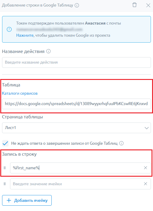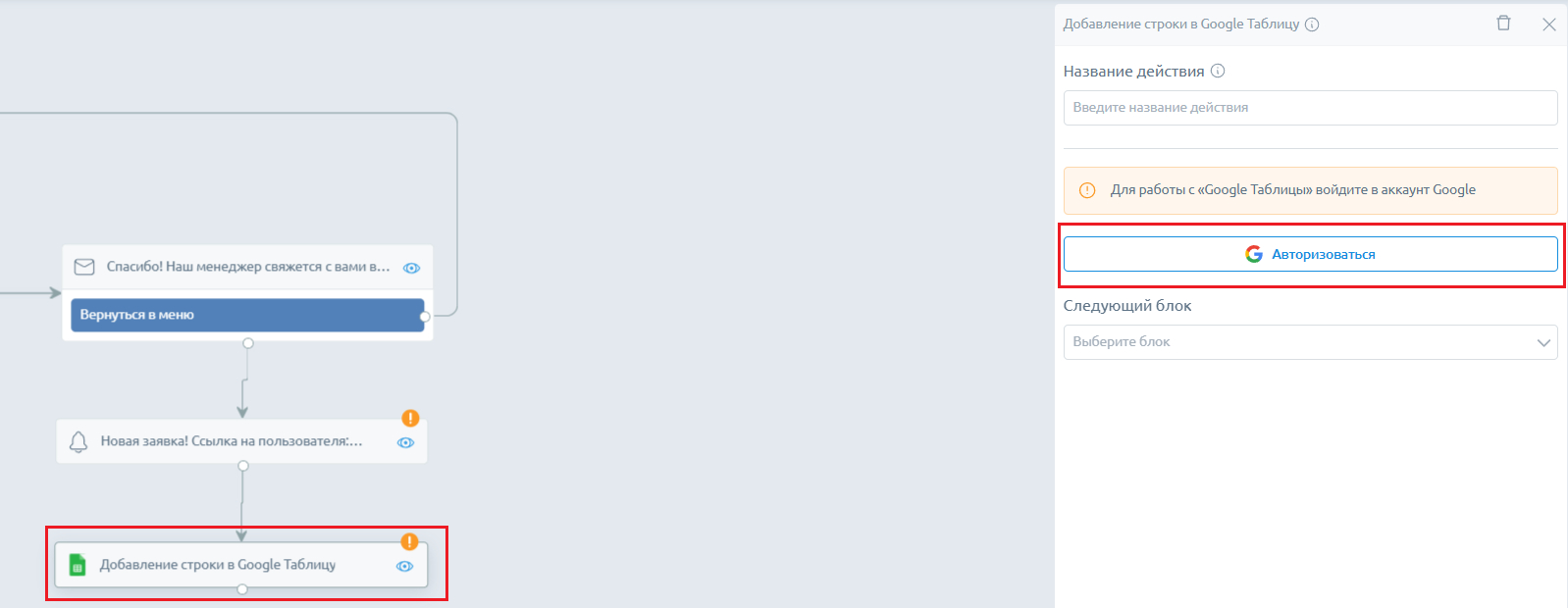 После уведомления сотруднику бот будет вносить данные пользователей в таблицу. Выбираем блок «Добавить строки в Google-таблицу» и в боковом меню нажимаем кнопку «Авторизоваться».