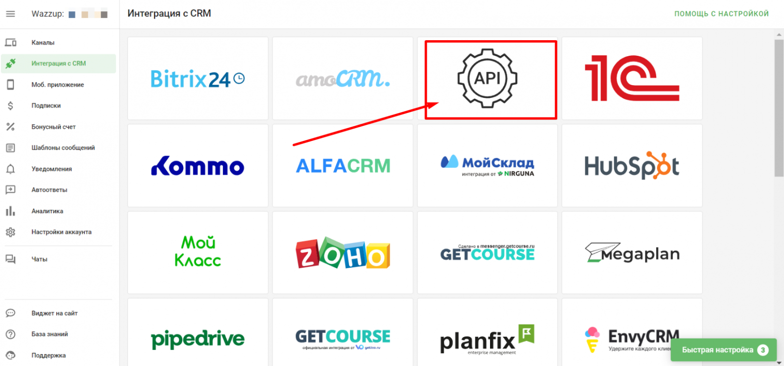 Настроить интеграцию с WABA можно через партнёра Smartbot — сервис-коннектор Wazzup. Зарегистрируйтесь на платформе и в личном кабинете выберите в меню «Интеграция с CRM» и иконку API.