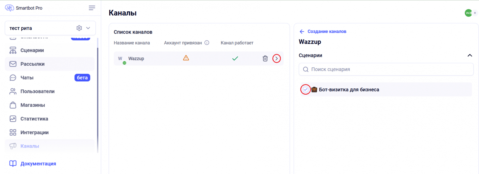 Когда вы зарегистрируйте бизнес-аккаунт, вернитесь в Smartbot Pro и привяжите канал Wazzup к сценарию, чтобы бот мог работать в WhatsApp. Как это сделать: