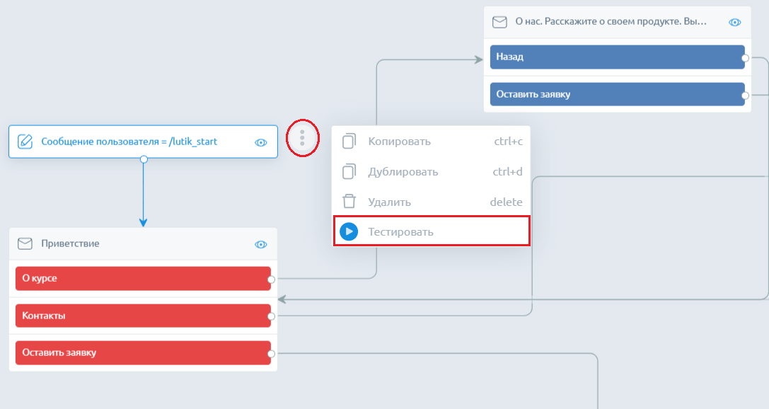 2. Заходим в сценарий бота и публикуем его. Перед этим вы можете протестировать каждый блок. Для этого нажмите на иконку и выберите «Тестировать», как это показано на скриншоте ниже.